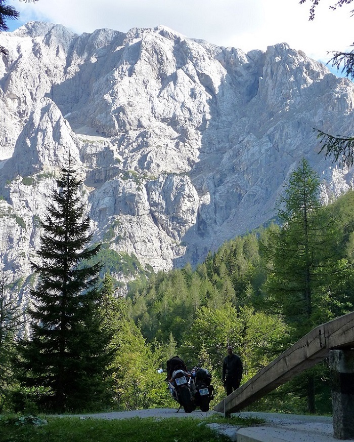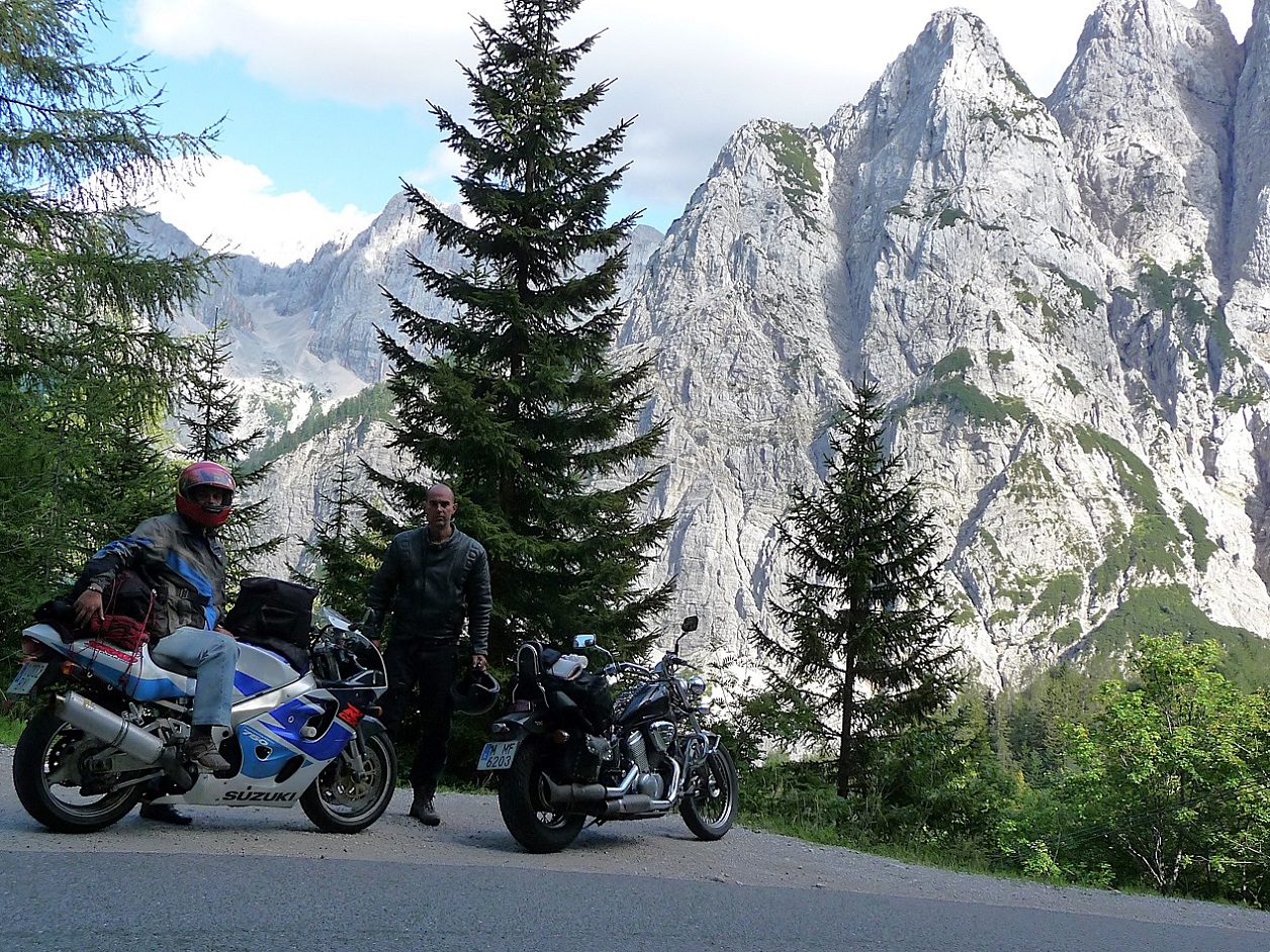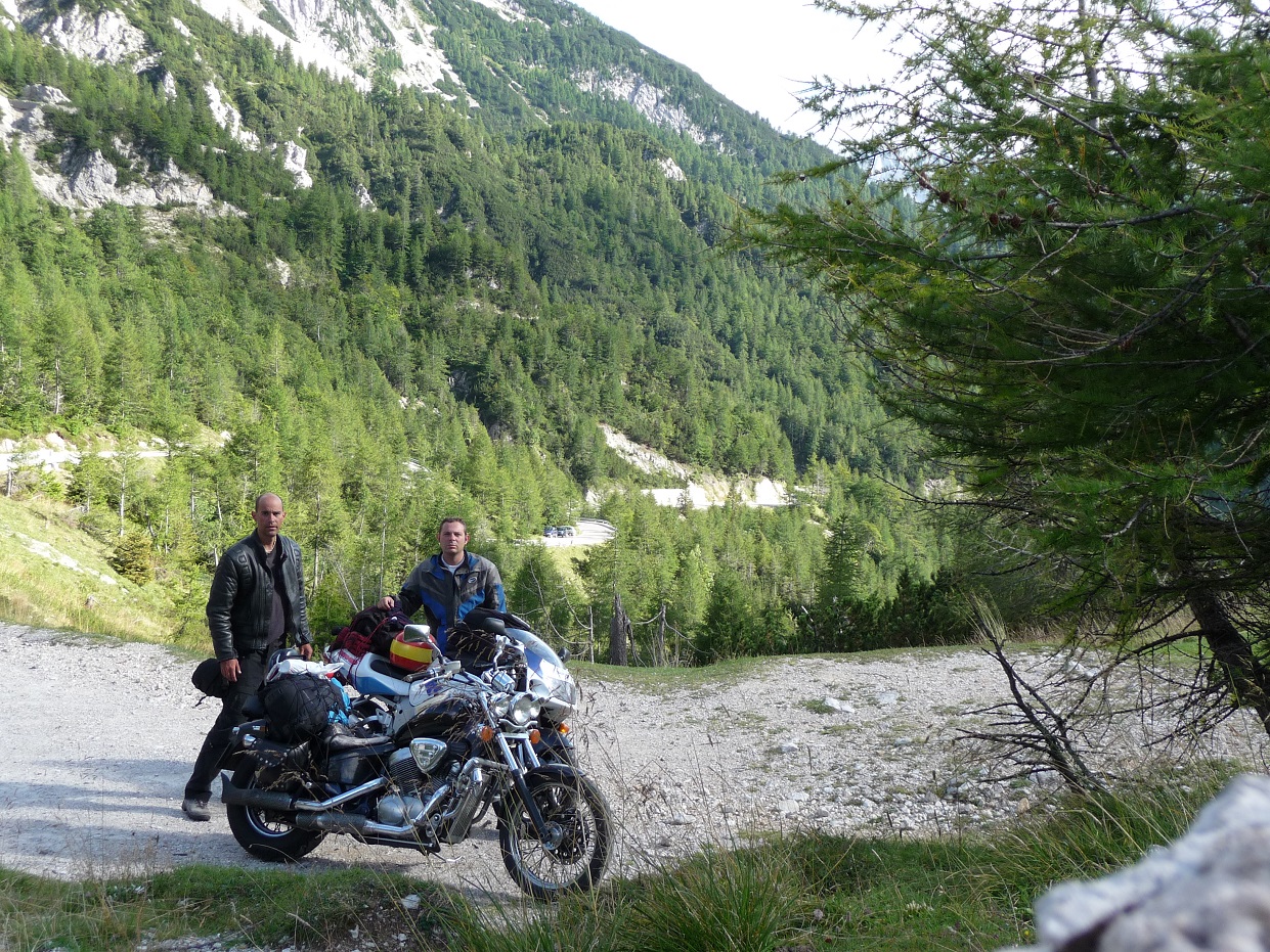 Y en un par de km más, llegamos a la frontera con Eslovenia, en lo alto del puerto de Predil. A partir de aquí entramos en el parque nacional del Triglav, con carreteras maravillosas y solitarias para rodar en moto. Al poco de entrar en Eslovenia, paramos en un sitio muy chulo en mitad de la carretera, para comer (foto de abajo a la derecha). Aquí además son otros precios, y podemos darnos banquetes que en Austria, y no digamos en Suiza, no podíamos.