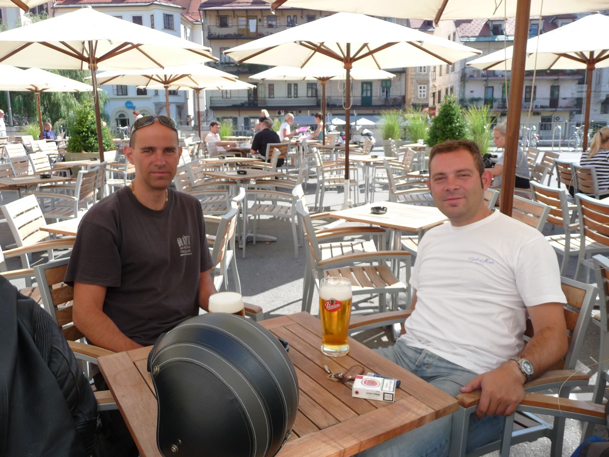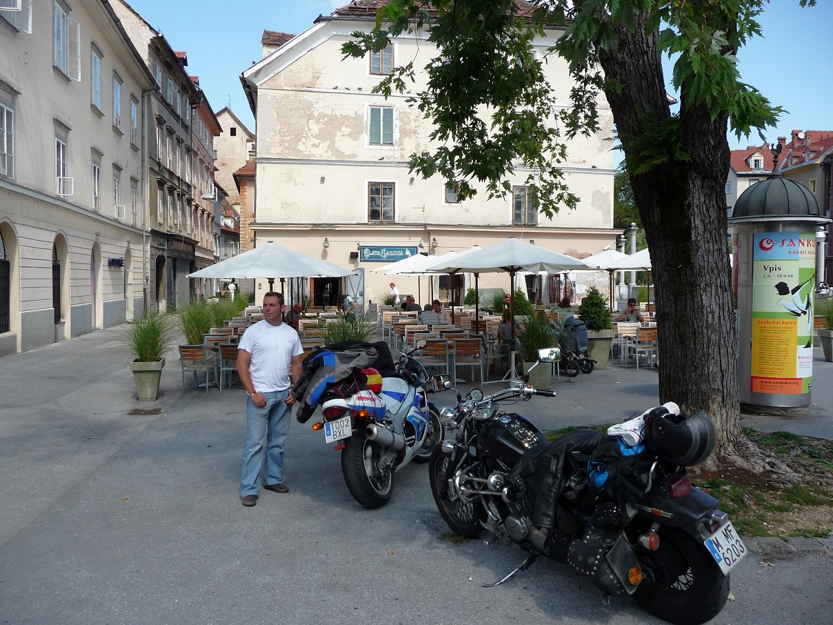 De esta manera, desde el lago Bled pusimos rumbo a Liubliana, la bonita capital de Eslovenia, donde hicimos una parada para tomar una cerveza y dar un paseo. Fuimos con las motos hasta el mismo centro histórico, y las dejamos junto a una fantástica terraza sombreada a la orilla del rio Ljubljanica, que atraviesa el centro de la ciudad. Las fotos de abajo son de nuestra parada en Liubliana.