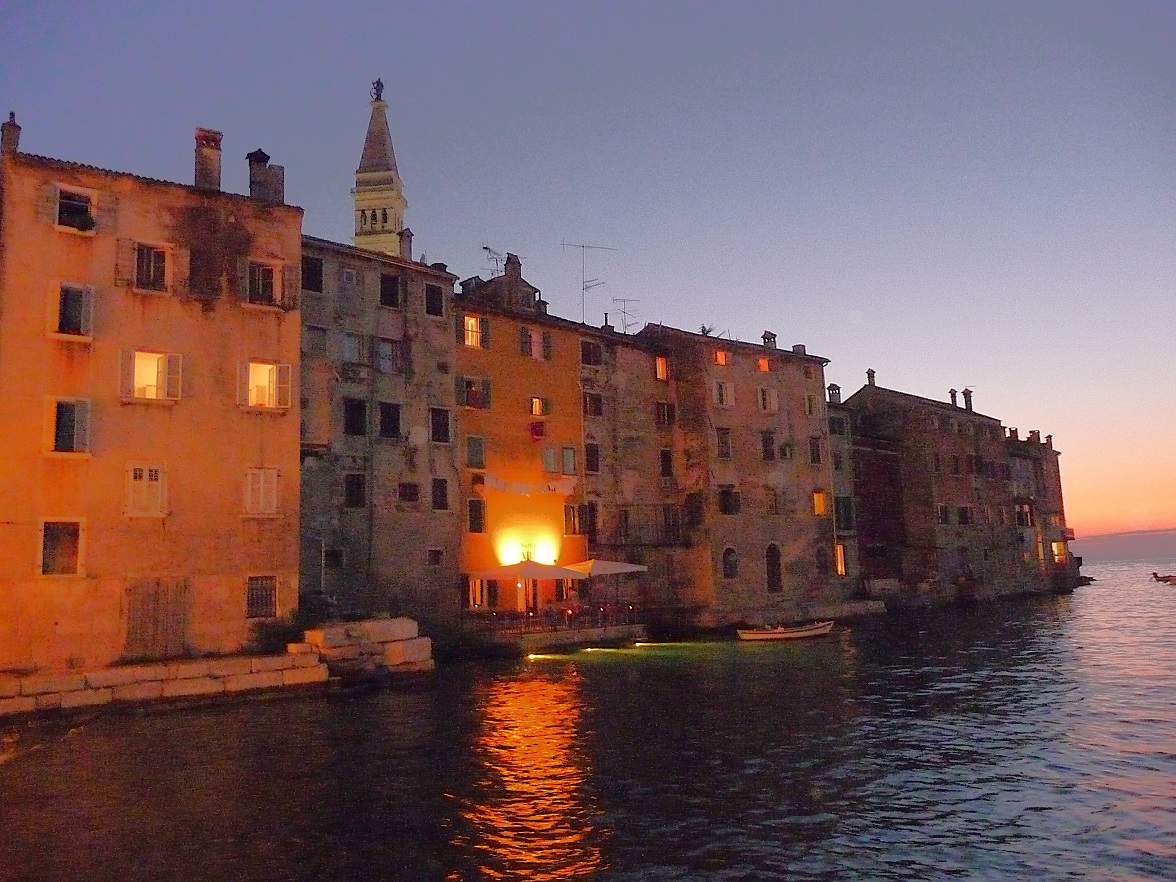Dimos un paseo por el interior de Rovinj, llegando hasta la iglesia y su campanario, en la parte más alta de la ciudad. Junto a la iglesia hay un bar con terraza muy chulo, mirando al mar (totalmente oscuro a esas horas) donde se estaba muy bien y nos tomamos unas cervezas antes de irnos a nuestro "sobe" a dormir. Al día siguiente empezaba la vuelta a casa, que había que hacerla en 4 días (habíamos tardado diez días en llegar hasta aquí).