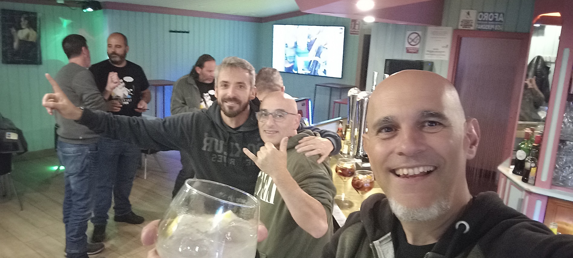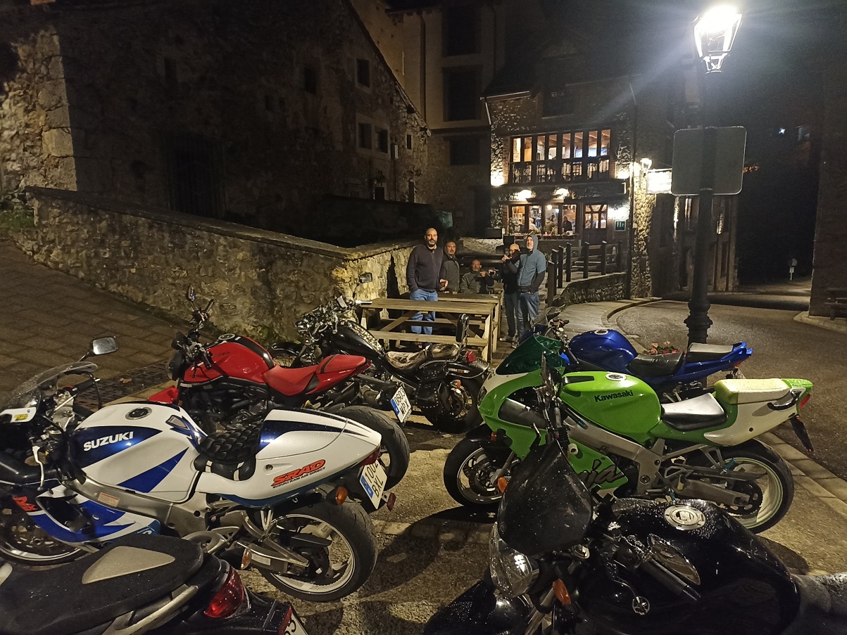 En el camino de vuelta a Sotres incluso nos llovió un poco, pero poca cosa. Nos instalamos en el hostal que teníamos reservado desde hace tiempo, y cenamos allí mismo, todo regado con unas buenas botellas de sidra asturiana. Después, una copa en el mismo lugar, pero tomando el fresco fuera, junto a las motos.