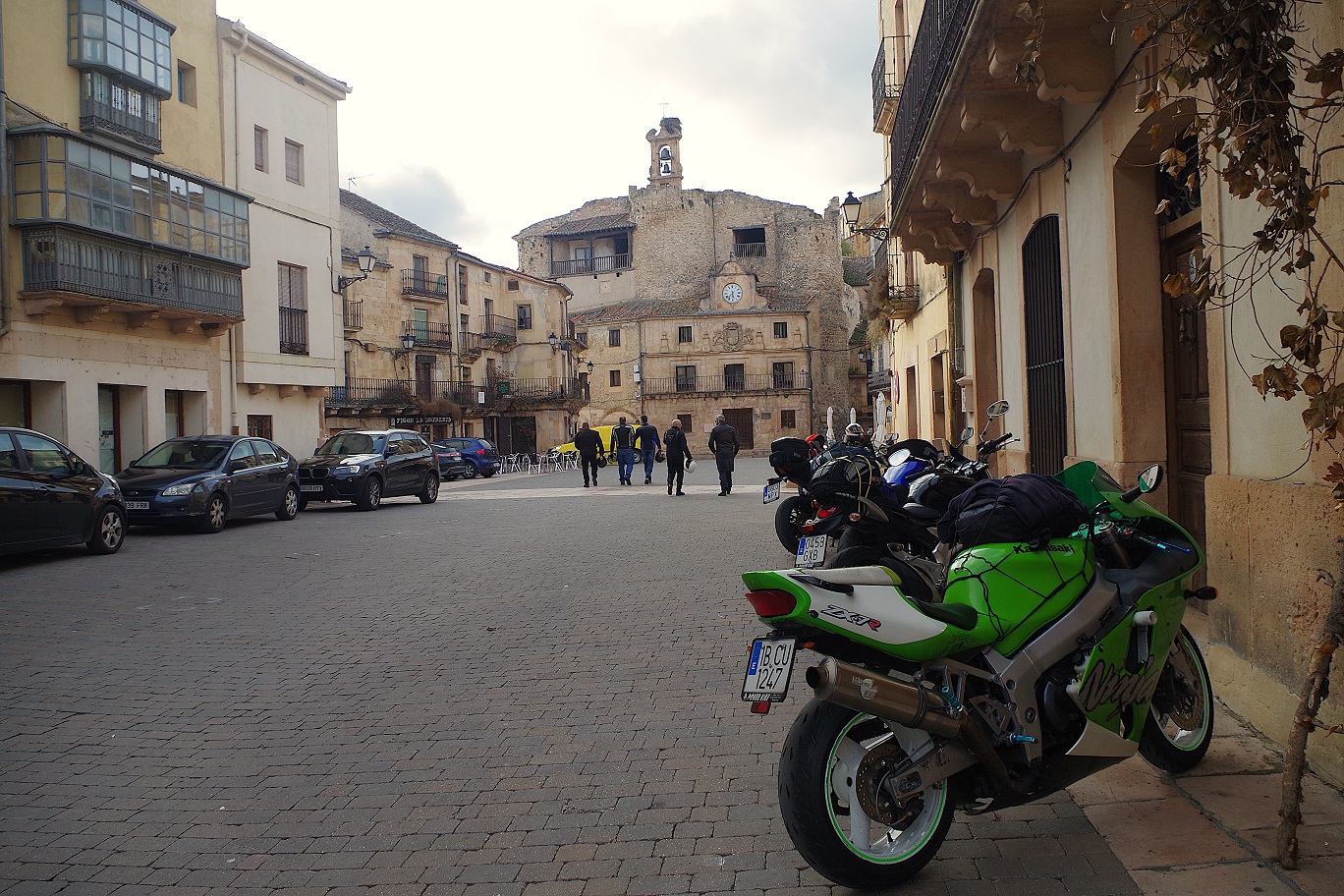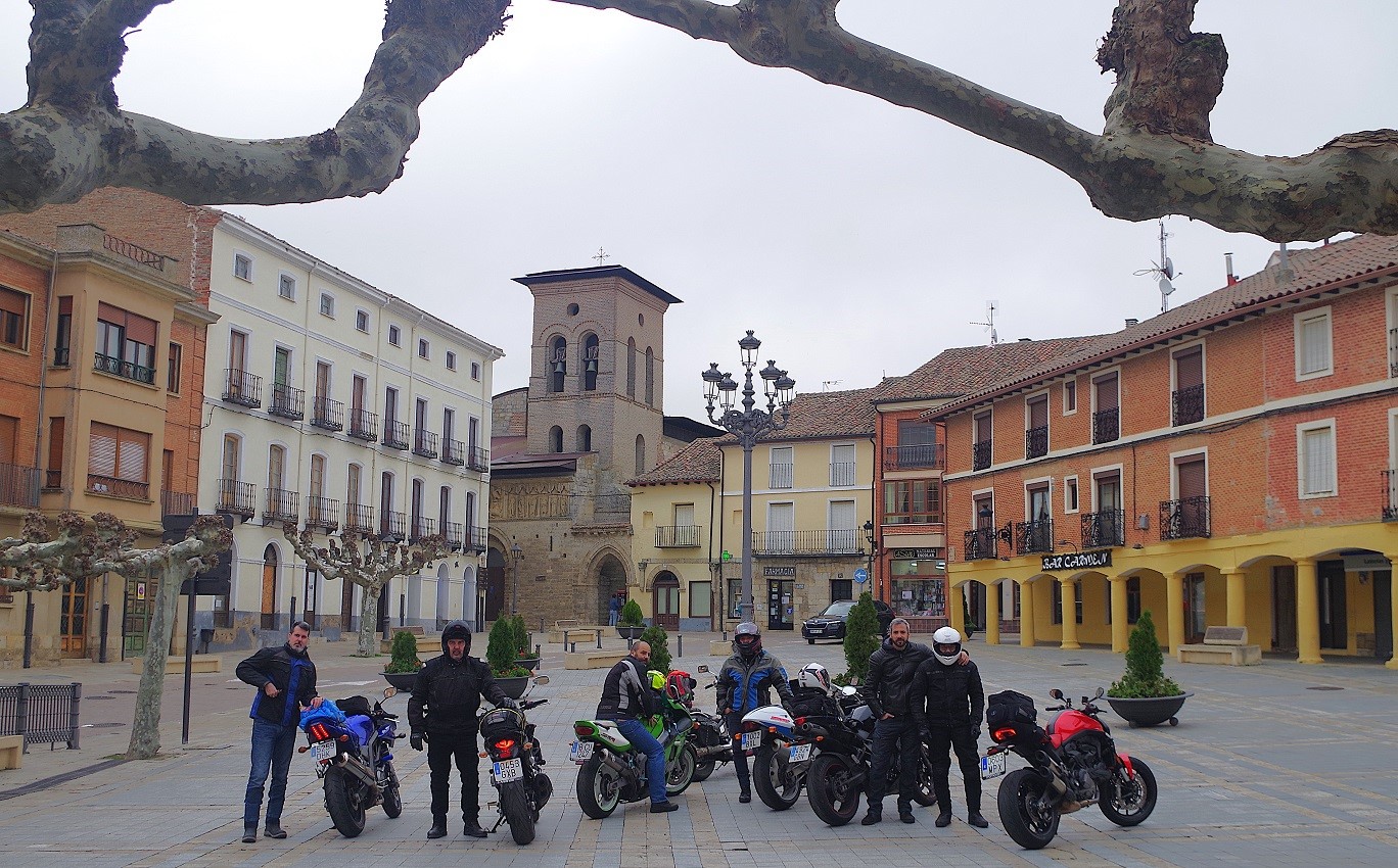 En la foto de la derecha, nuestras motos aparcadas en la misma plaza, al pie del hostal. Al fondo se ve la iglesia de Santiago, uno de los principales templos de este pueblo, que es hito importante del Camino de Santiago. De hecho, las únicas personas que vi en la calle a esas horas eran peregrinos que ya habían empezado la ruta del día.