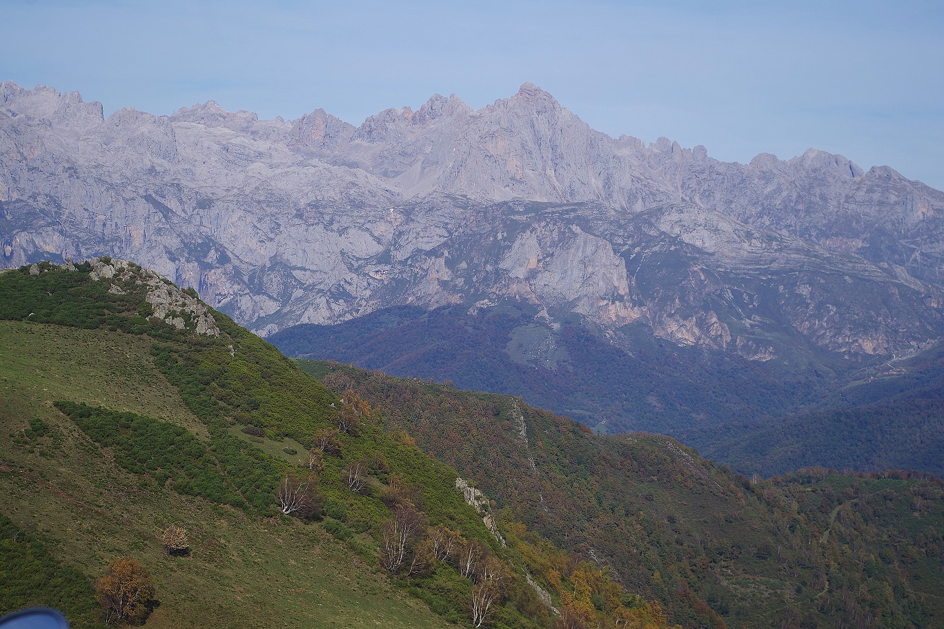 Desde el parador volvimos a Cervera, para coger la carretera que nos lleva a Cantabria pasando por el puerto de Piedrasluengas, todo un clásico en las rutas moteras en la cordillera Cantábrica. Al llegar a la cima, hicimos una parada para contemplar las vistas desde el mirador que hay en el puerto. Desde aquí hay unas vistas magníficas de los picos de Europa al fondo, y los inmensos bosques de robles que se extienden a nuestros pies, que ahora en pleno mes de octubre tienen unos colores espectaculares.