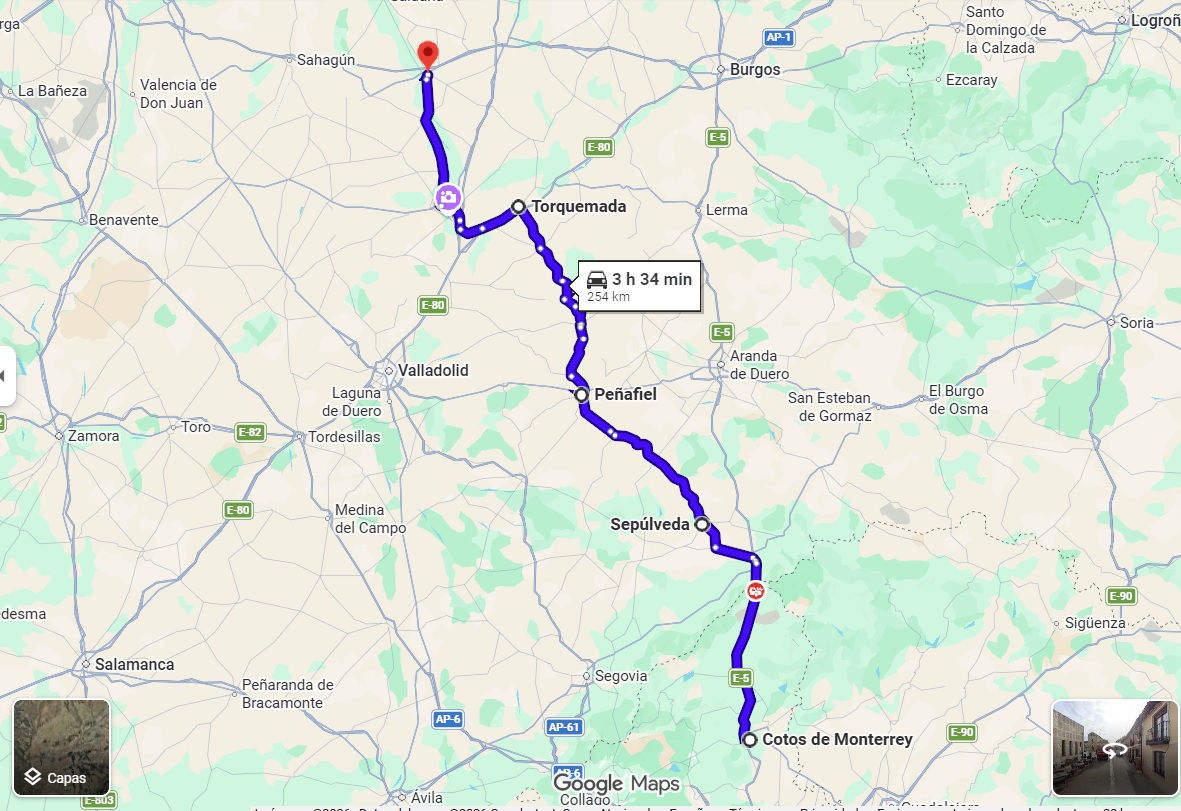 - Día 1: Desde Cotos de Monterrey hasta Carrión de los Condes, parando en Sepúlveda, Peñafiel y Torquemada. Unos 243 km.