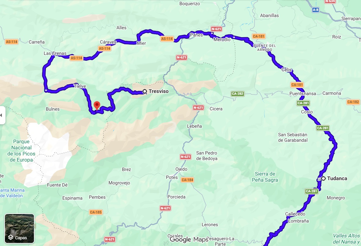 - Día 2: Desde Carrión de los Condes hasta Sotres, parando en Villaverde de la Peña, Ruesga, parador de Cervera de Pisuerga, puerto de Piedrasluengas, Pejanda, Tudanca y Tresviso. Unos 250 km.