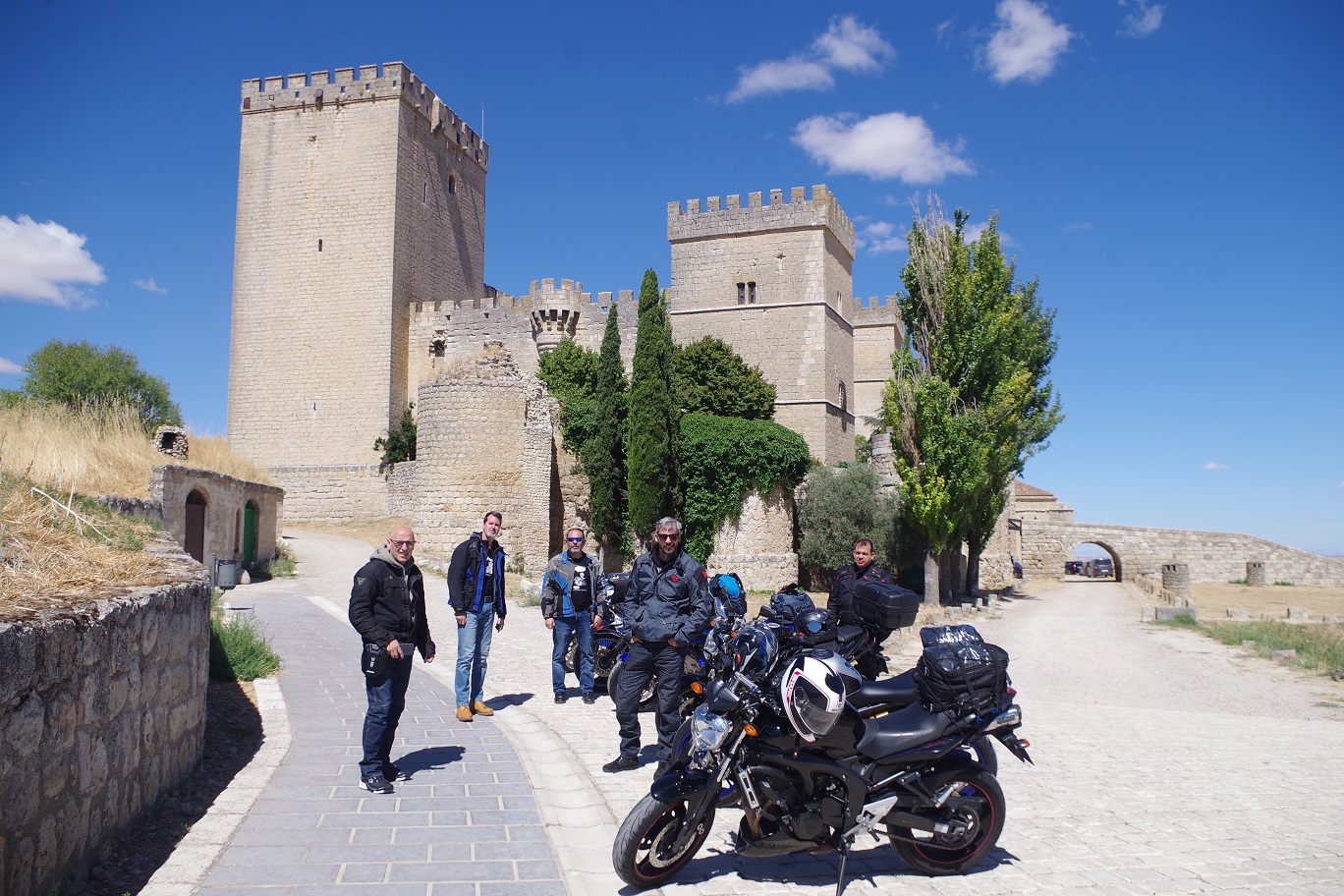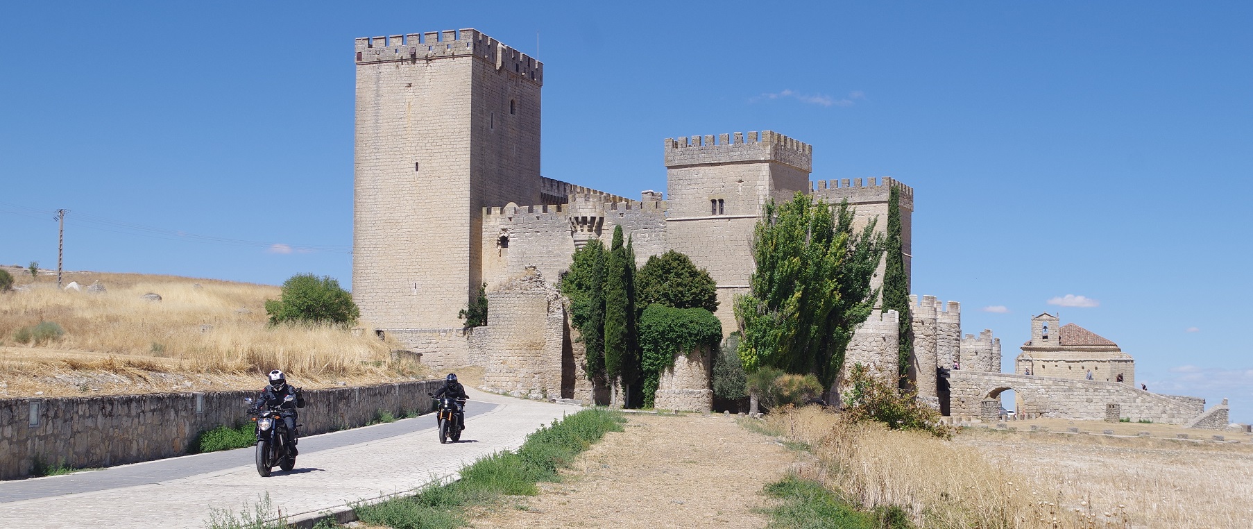 Nada más bajar de Somosierra, nos desviamos en Cerezo de Abajo por la carretera provincial que va directa hasta Cuéllar. Es una carretera con unas buenas vistas hacia la sierra, a la izquierda, y un agradable paisaje campestre. Es bastante recta y se puede ir ligero. En Cuéllar, a 86 km de la parada en Somosierra, paramos de nuevo en una terraza con vistas al enorme castillo, que en los últimos años lo han rodeado con un muro que estropea completamente la vista.