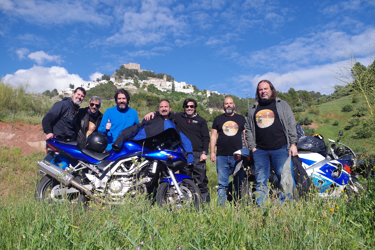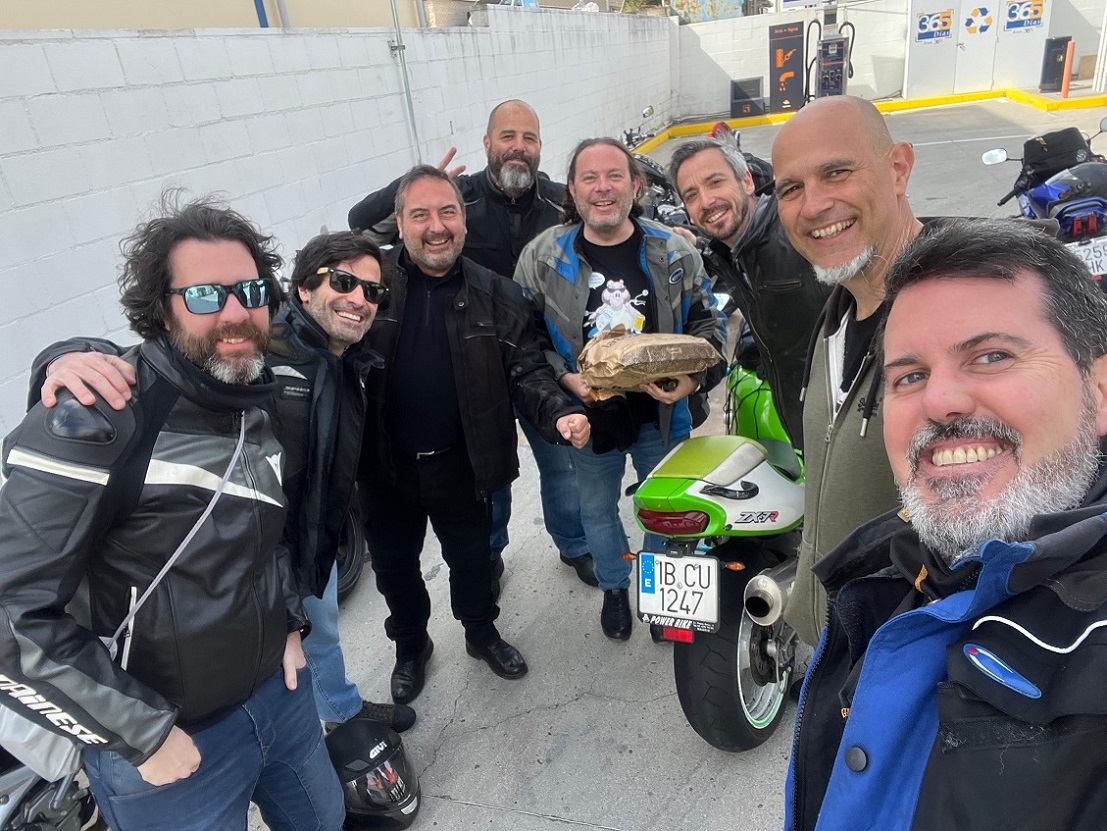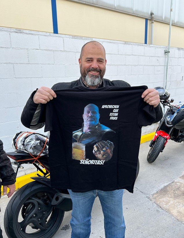 Este viaje era hacia el sur, así que no quedamos en nuestro sitio habitual, que es la gasolinera de Cotos de Monterrey en la A-1, sino en la gasolinera que está cerca del centro comercial Nassica, en la A-4. Allí, una vez nos juntamos todos, repartimos las camisetas que habíamos hecho por el 50 cumpleaños de Darío.