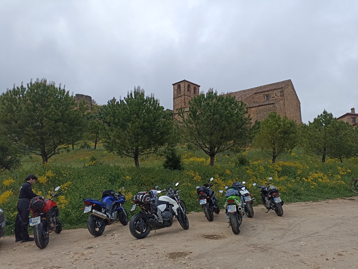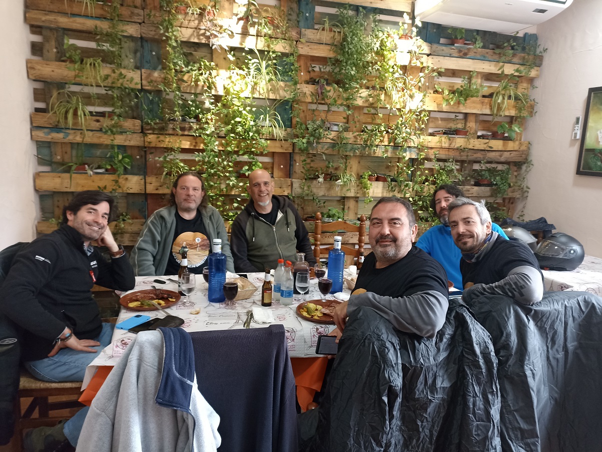 La verdad es que comer allí fue todo un acierto. Pedimos carne a la brasa, que la hacían en un buen fuego de leña que tenían tras la barra, y estaba todo buenísimo. Con el frio que teníamos, fue como revivir de nuevo. Después de los cafés, paró de llover por fin, así que volvimos a las motos. Justo nada más dejar el restaurante empezaba la subida al pequeño puerto de Riopar, y cuando estábamos en la cima, más o menos, empezó a llover de nuevo. Continuamos un poco más hasta que llegamos al desvío de Riopar Viejo, una antigua aldea situada en lo alto de una colina. Allí teníamos otra taberna esperándonos para darnos cobijo, y casualmente coincidimos con otros moteros, aunque se fueron antes que nosotros.