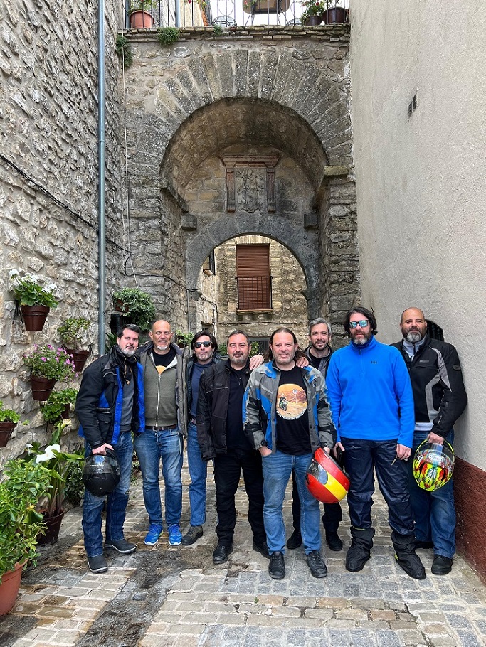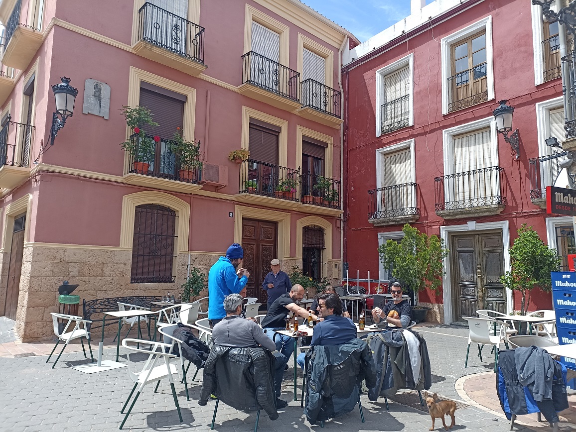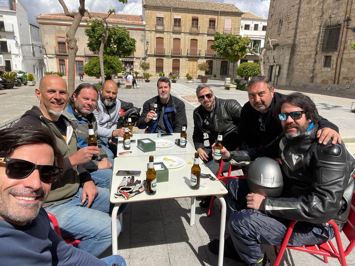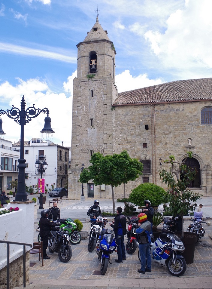 Nos metimos con las motos por unas callejuelas realmente estrechas, hasta que al pasar por un arco, salimos a una bonita plaza presidida por la iglesia, donde una fantástica terraza nos estaba esperando con los brazos abiertos. Ya teníamos una mesa preparada y todo, como si nos estuviesen esperando. Allí cayeron las primeras cervezas del día, y fue un rato muy agradable.