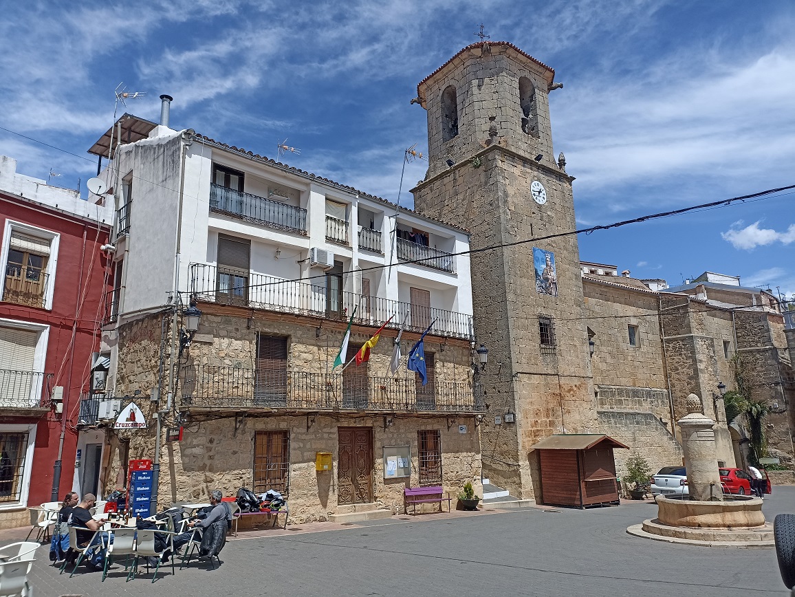 Despues de ese rato de descanso y risas, continuamos viaje. Hicimos unos 32 km por una carretera solitaria, camino de las estribaciones de Sierra Morena, hasta Chiclana de Segura, donde hicimos otra parada en la solitaria plaza mayor del pueblo.