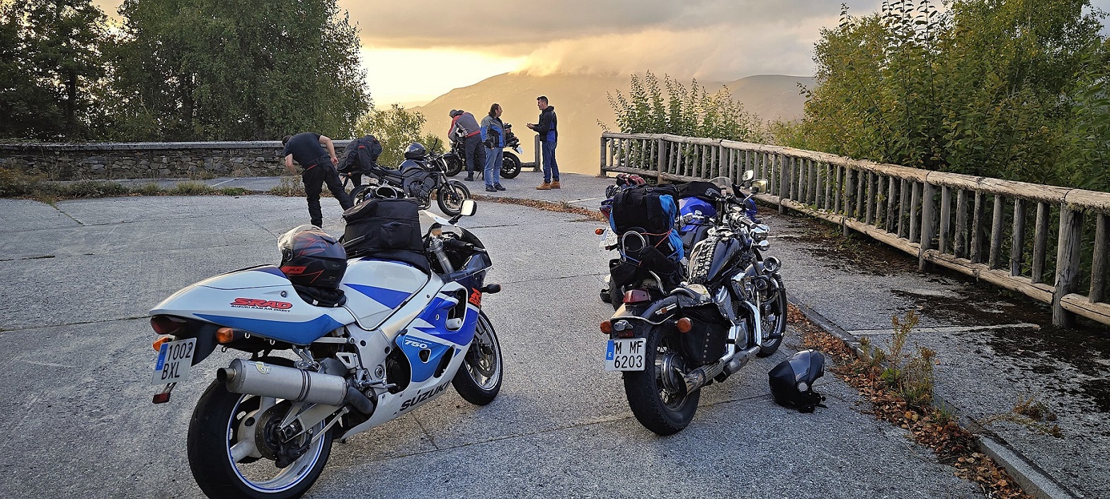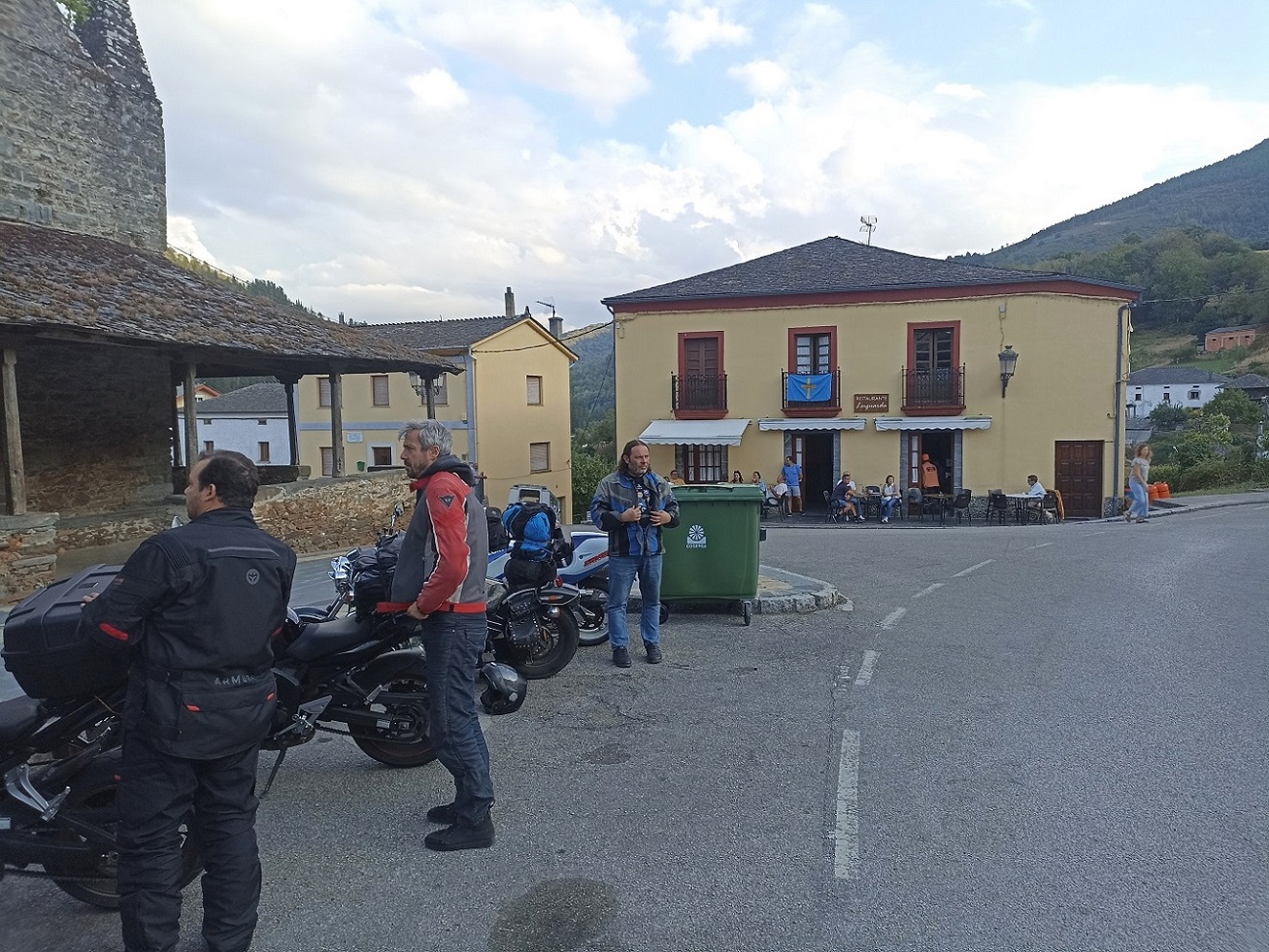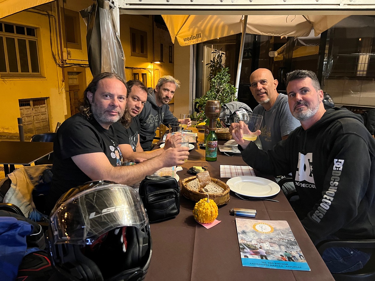 Cuando volvimos a coger las motos, el sol ya se había puesto, así que durante la bajada se nos hizo de noche. Al acabar la bajada, hicimos una última parada en la taberna de Ventanueva, y ya desde allí directos hasta Cangas de Narcea. En total desde el puerto a Cangas, unos 31 km. Como nuestro hotel estaba a las afueras del pueblo, cenamos antes de ir en una sidrería de Cangas, como podéis ver en la foto de arriba a la derecha. Y el día ya no daba para más...