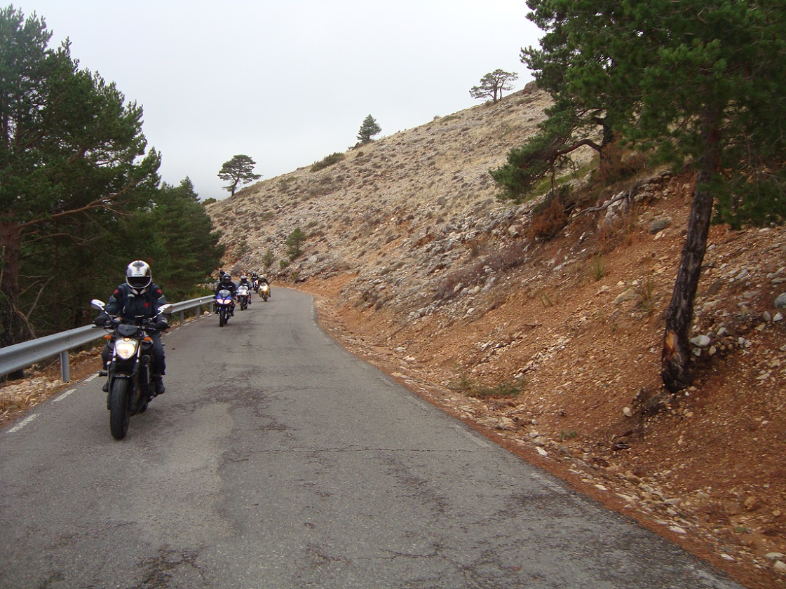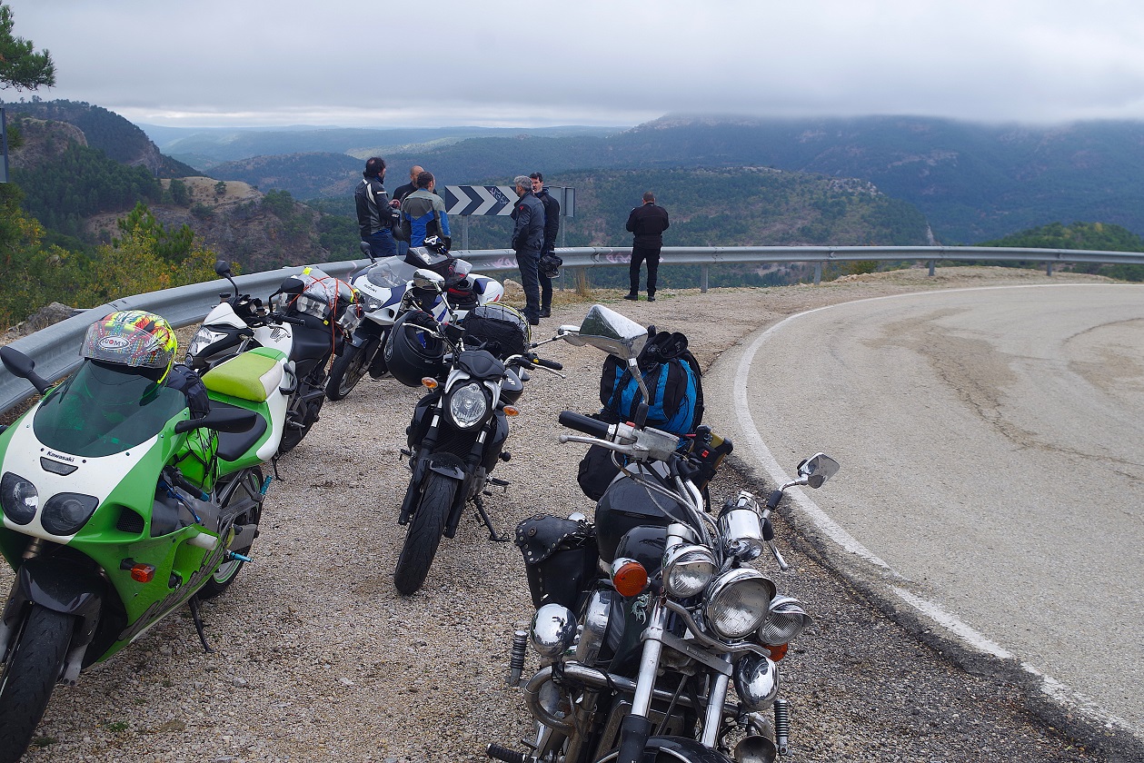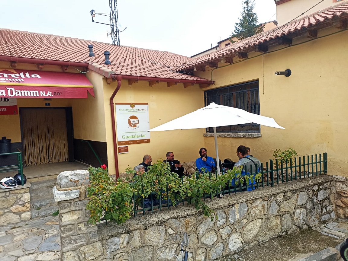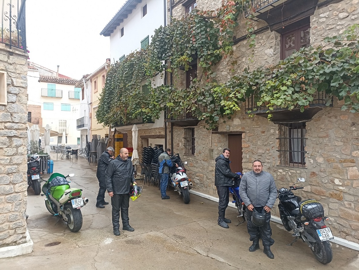 Nos acercamos al garaje a por las motos, que estaba justo detrás de la plaza mayor, y emprendimos la ruta del día. No empezó bien la cosa, ya que salimos con lluvia débil. Paramos en La Puebla de Valverde a llenar depósitos, y seguía lloviendo. A partir de aquí fuimos por una carretera bastante montañosa, la sierra de Javalambre. Una pena el tiempo, que no nos dejó disfrutar de esa carretera. Por fin, al llegar a Riodeva, dejó de llover, y aprovechamos para hacer la primera parada del día en este pequeño pueblo perdido en mitad de la montaña. Había un único bar, y por suerte estaba abierto, así que no nos lo pensamos.