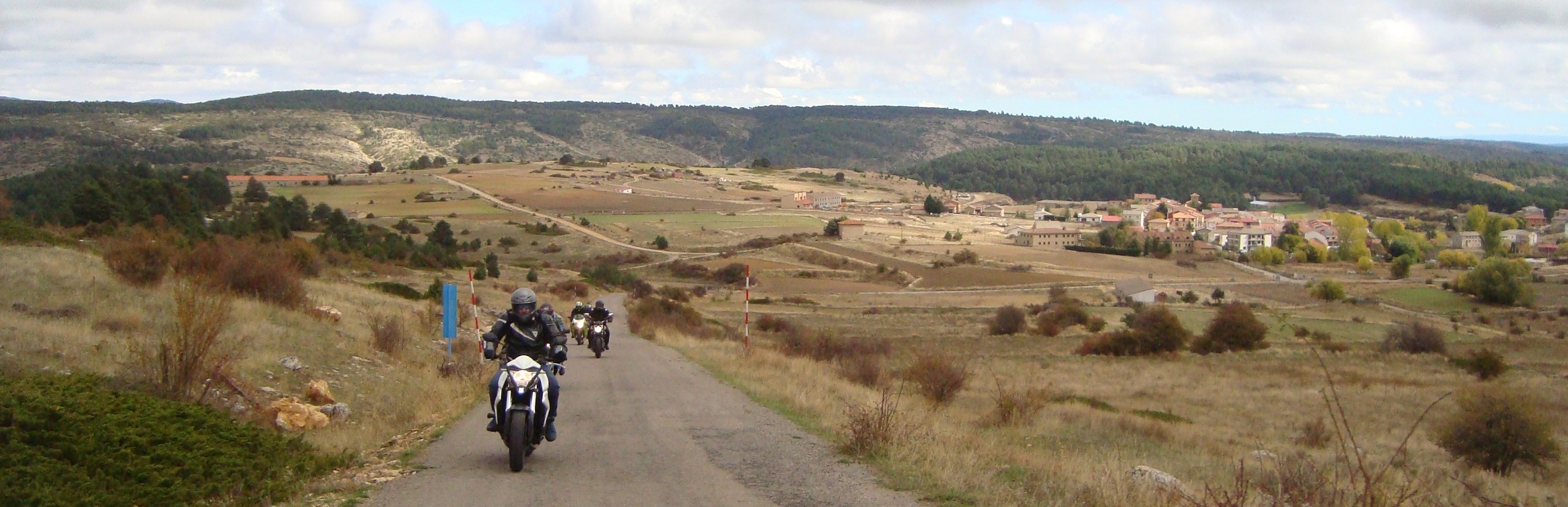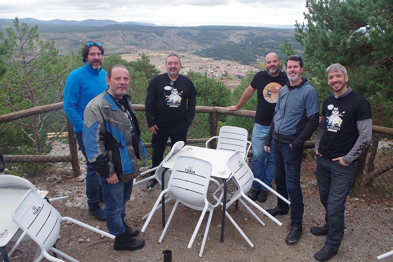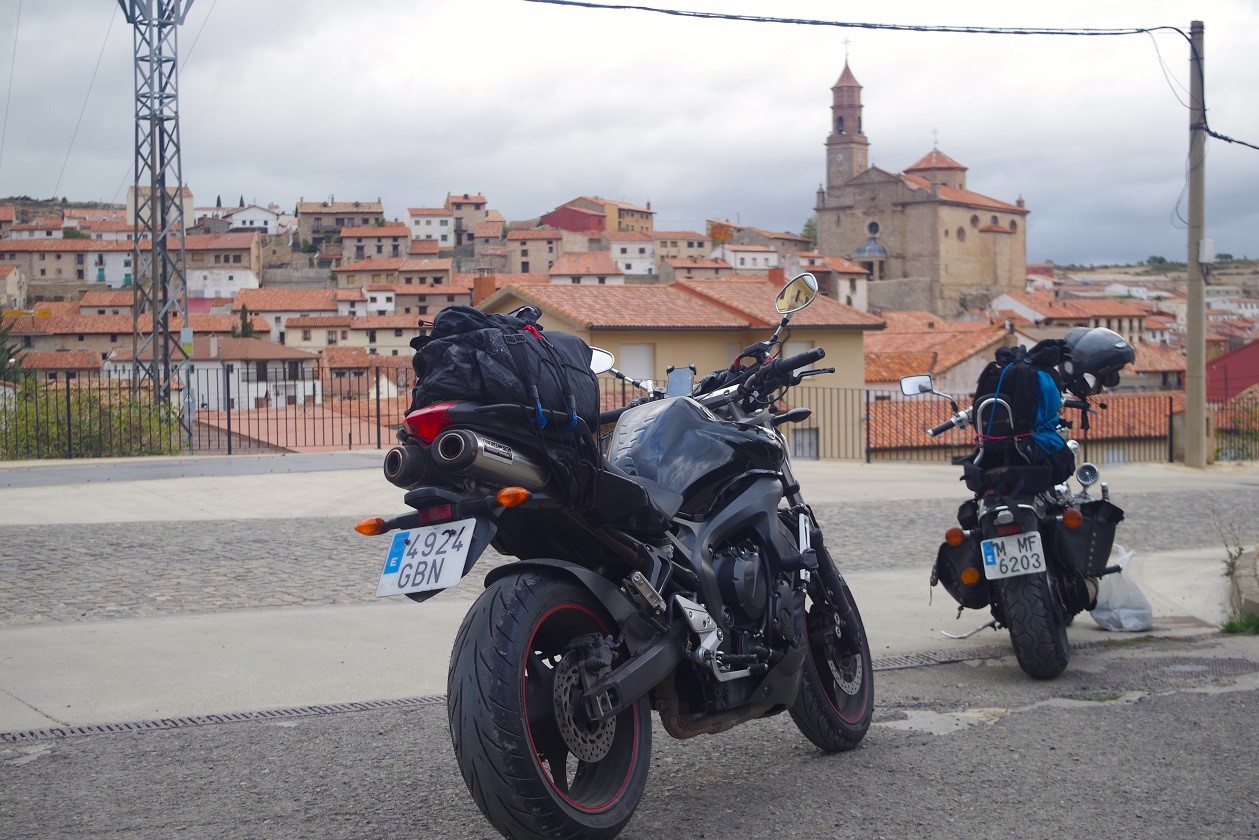 Nos acercamos al garaje a por las motos, que estaba justo detrás de la plaza mayor, y emprendimos la ruta del día. No empezó bien la cosa, ya que salimos con lluvia débil. Paramos en La Puebla de Valverde a llenar depósitos, y seguía lloviendo. A partir de aquí fuimos por una carretera bastante montañosa, la sierra de Javalambre. Una pena el tiempo, que no nos dejó disfrutar de esa carretera. Por fin, al llegar a Riodeva, dejó de llover, y aprovechamos para hacer la primera parada del día en este pequeño pueblo perdido en mitad de la montaña. Había un único bar, y por suerte estaba abierto, así que no nos lo pensamos.