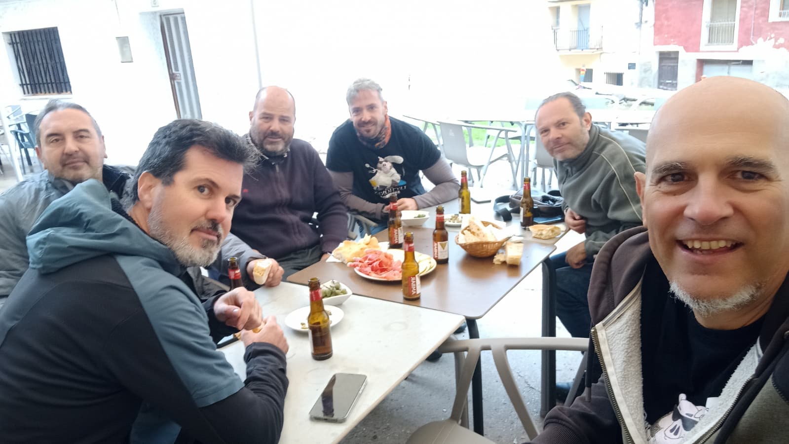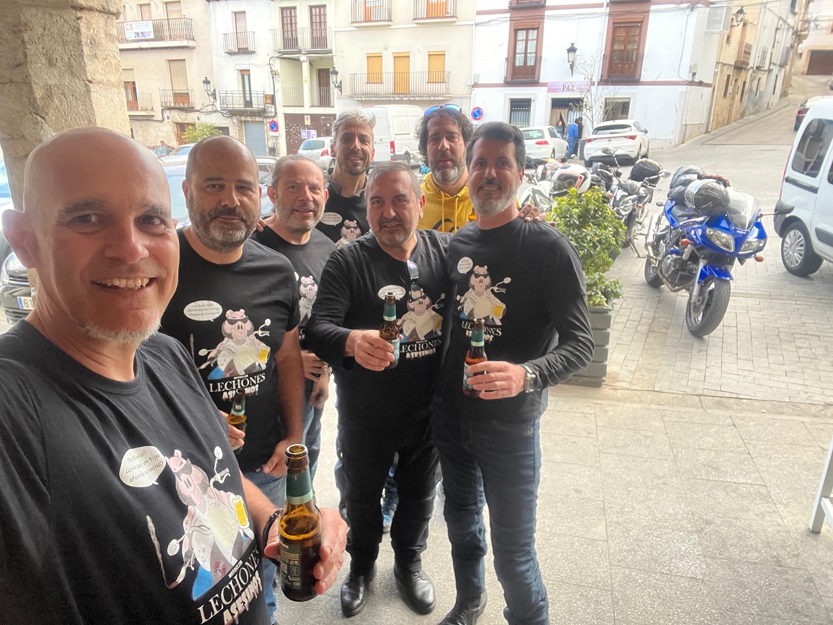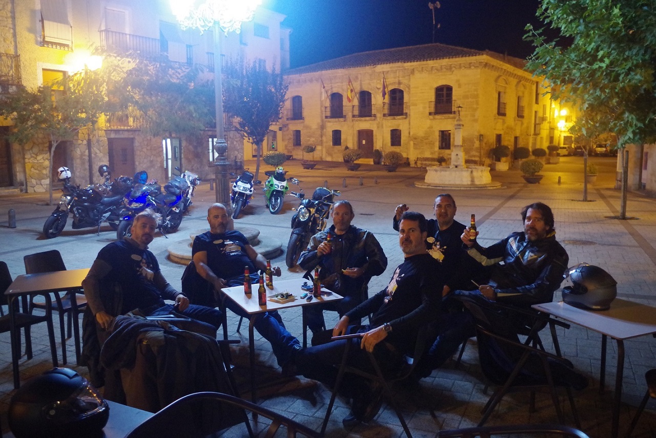 Este viaje era hacia el este, así que en esta ocasión el sitio de quedada general fue la plaza de Horche, un pueblo cerca de Guadalajara, donde hay un bar en el que ya hemos estado en alguna que otra ocasión. Los primeros en llegar fueron Darío y Carlos, y cuando por fin nos juntamos todos, un poco más tarde de lo planeado, nos tomamos una última ronda todos juntos.