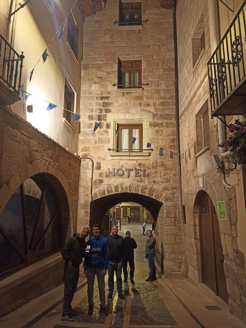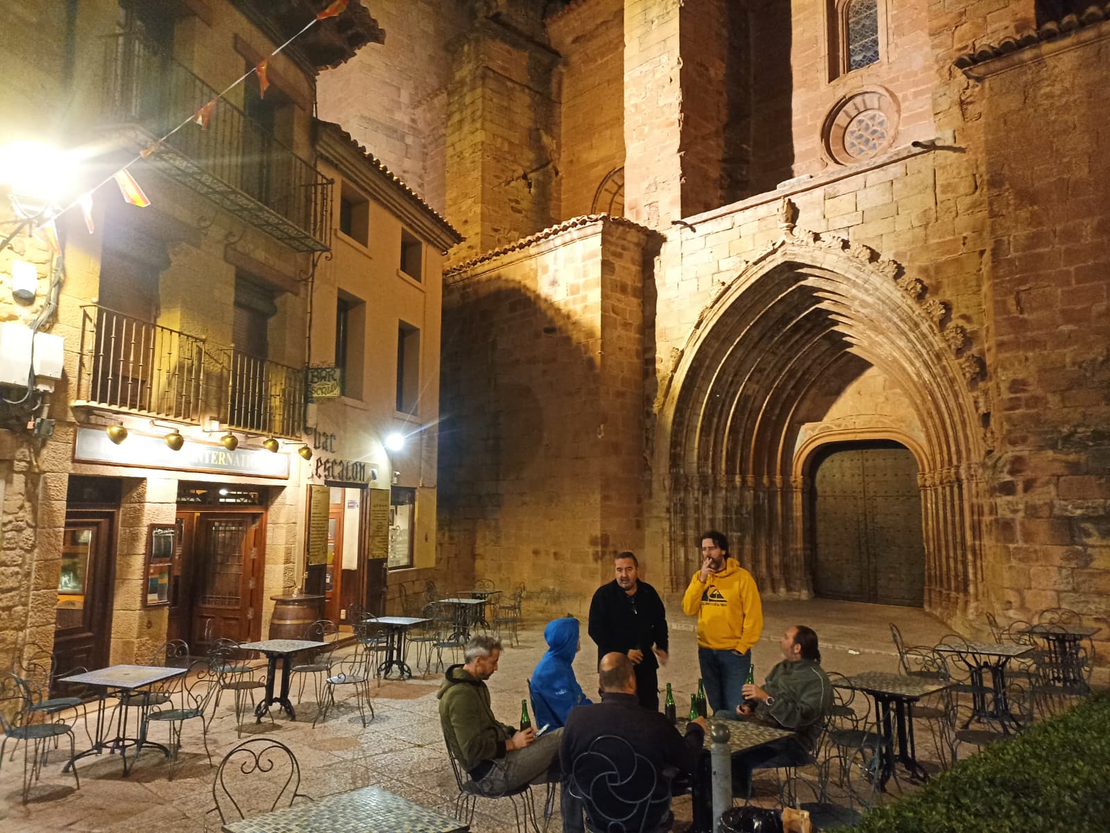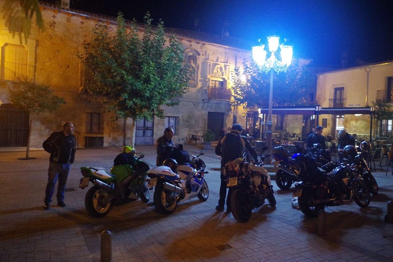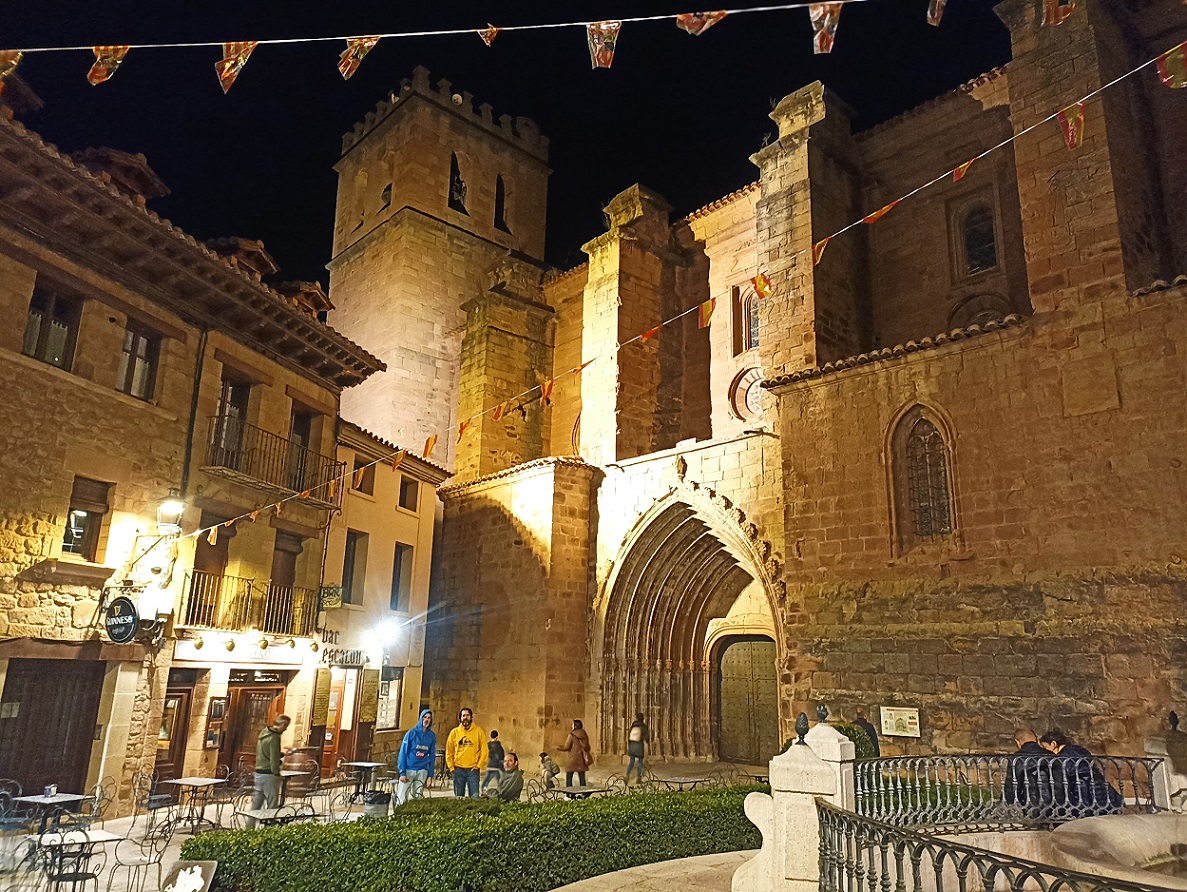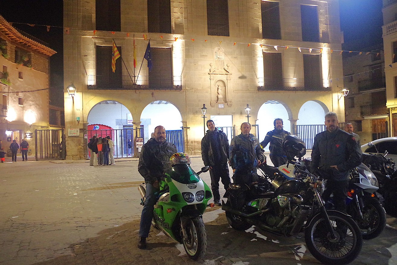 Fuimos directamente a la plaza, donde estaba el alojamiento que habíamos reservado, el hotel Jaime I, en plena plaza mayor. Por suerte, tenían un garaje donde pudimos meter las motos. Una vez instalados, fuimos a la cercana plaza de la iglesia, donde hay una fantástica terraza al pie de la enorme colegiata de Santa María. Allí estuvimos un buen rato tomando unas cervezas, e incluso acabamos cenando en ese mismo sitio, pero ya en el interior.