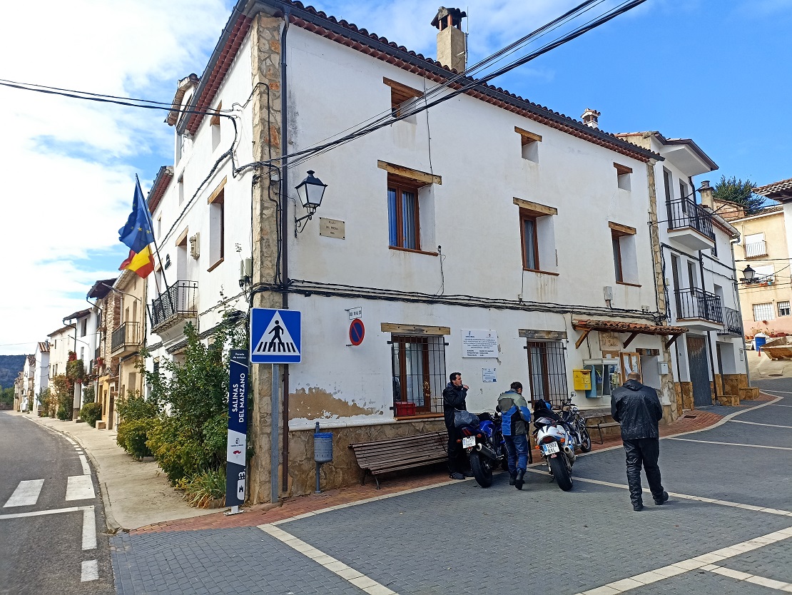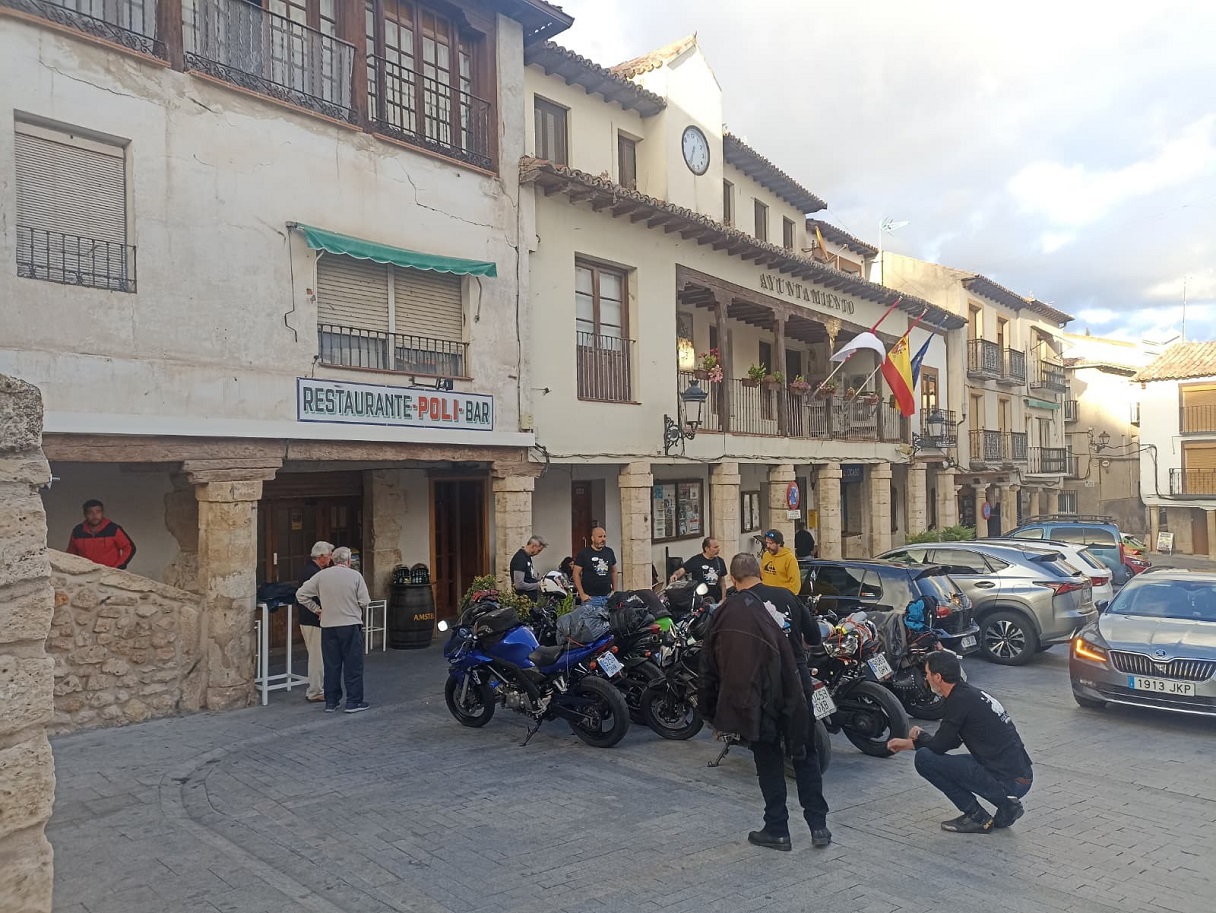 Desde aquí ya no volvió a llover más, incluso acabó saliendo el sol. Aun disfrutamos de unos km más de carretera de montaña hasta desembocar en la N-420 que va directa a Cuenca, ya a partir de ese momento la conducción se vuelve más aburrida. Hicimos otra parada más antes de llegar a Cuenca en Salinas del Manzano, que tiene un bar muy chulo justo al lado de la carretera, en una plaza donde se pueden dejar bien las motos.