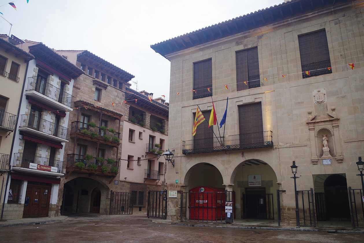 En la foto de abajo a la izquierda, nuestro hotel, el Jaime I, a la izquierda del ayuntamiento, y en la foto de al lado, visto desde el otro lado del arco, camino de la plaza de la iglesia. En la foto de la plaza, aun se ven las vallas que habían instalado para cerrar completamente la plaza durante la suelta del toro.