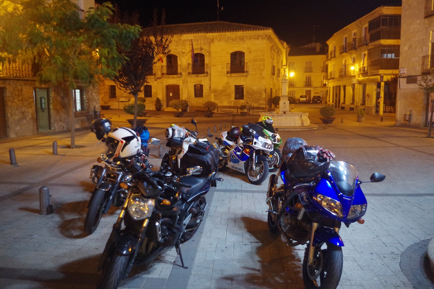 Cuando tocó coger las motos otra vez, hacía ya bastante frio, pero por suerte estábamos a solo diez minutos de Cañamares, donde teníamos el hostal reservado. Cañamares es un pueblo pequeño en la Serranía de Cuenca, sus calles estaban vacías y silenciosas cuando llegamos. Después de instalarnos, fuimos dando un paseo hasta las proximidades de la plaza, donde estaba el que debía ser el único restaurante abierto. Allí cenamos, y después tomamos una copa antes de ir a dormir. Abajo, nuestras motos aparcadas junto al hostal, y el mapa de la ruta de ese día desde Horche.