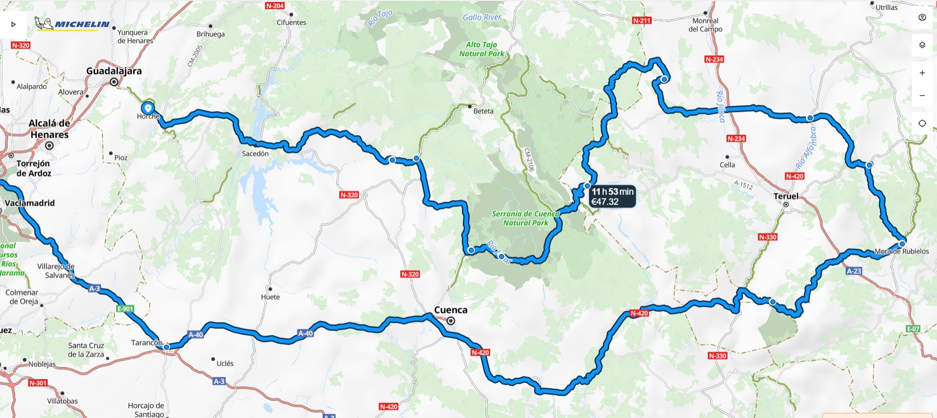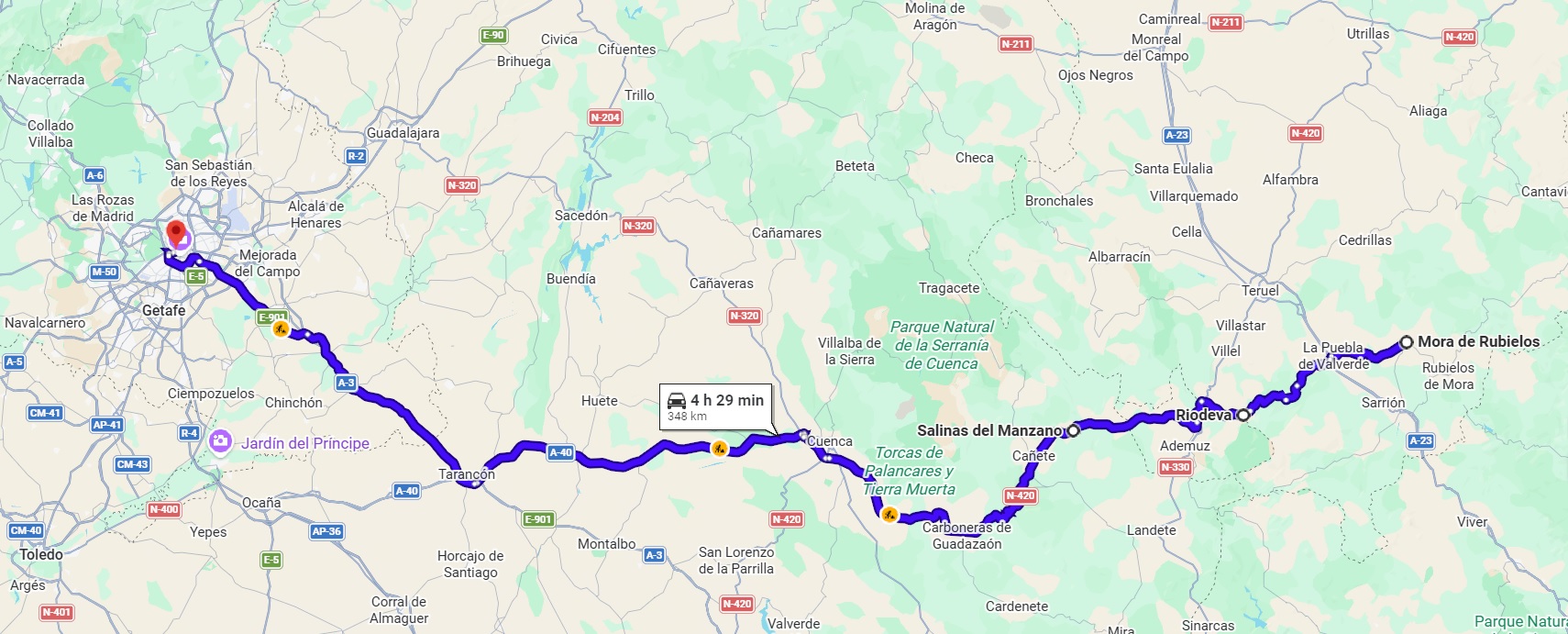 - Día 3: Desde Mora de Rubielos hasta Madrid, parando en Riodeva y Salinas del Manzano, y en Tarancón para comer. Unos 348 km.