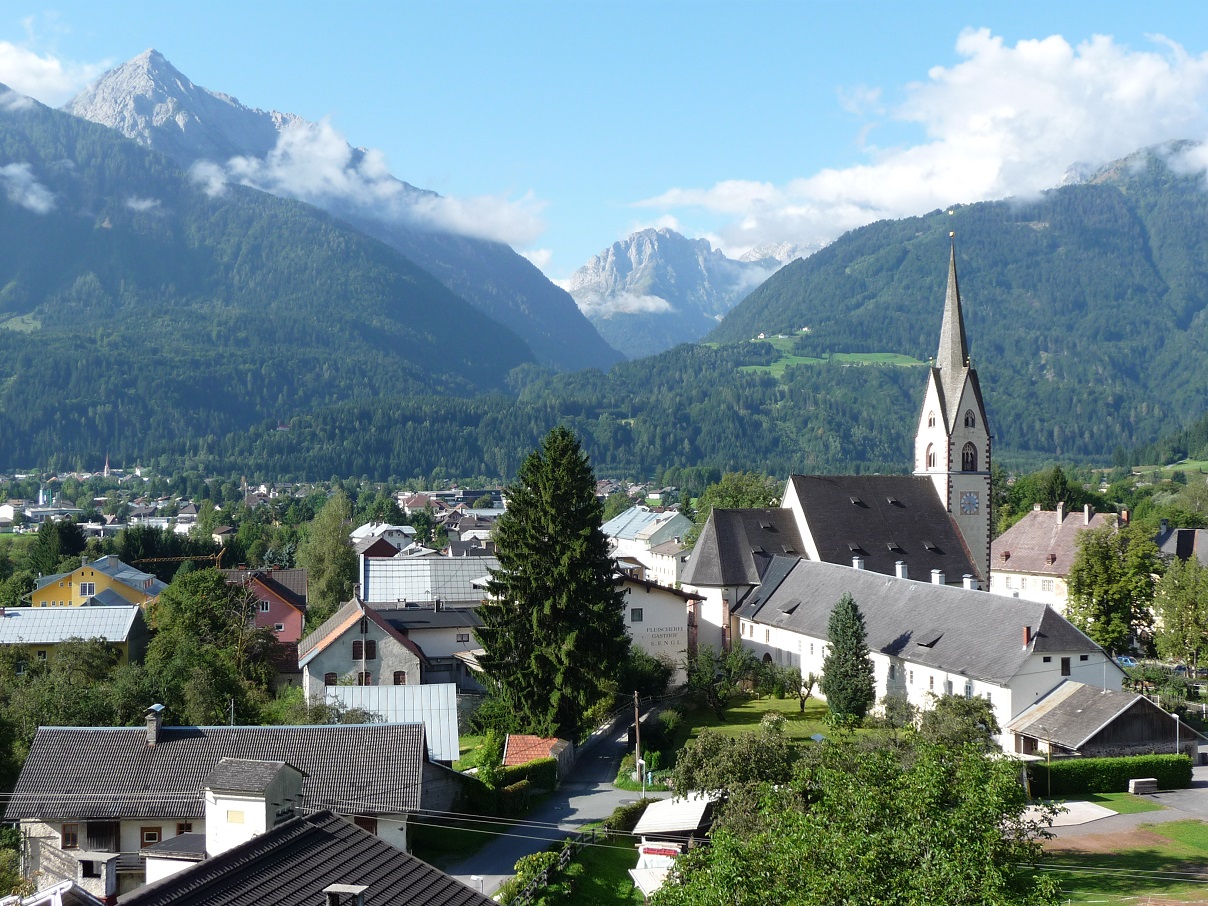 Desde allí veíamos el casco urbano de Mauthen bajo nosotros, destacando su puntiaguda iglesia, y al fondo las alturas de los Alpes Cárnicos, cordillera que hace de frontera entre Austria e Italia. Y hacia allí es justo donde nos íbamos a dirigir.