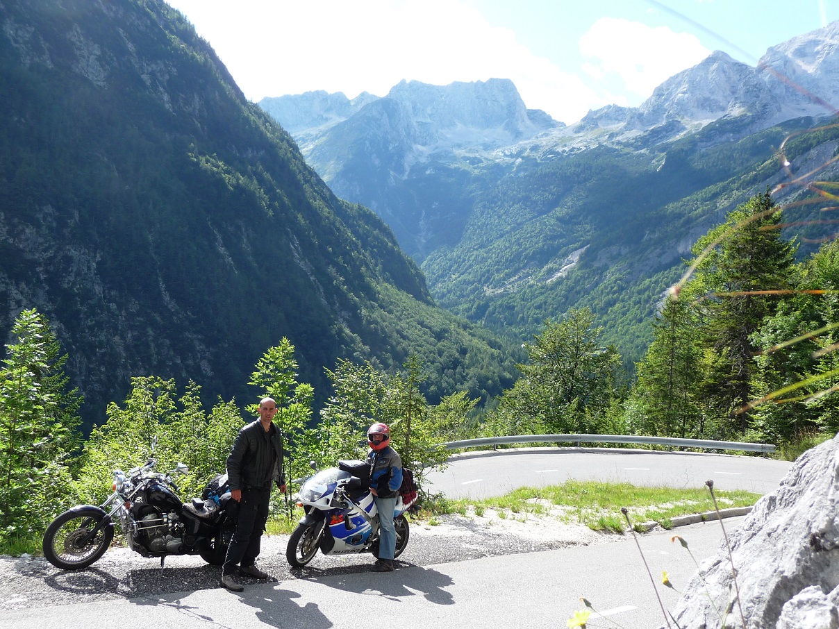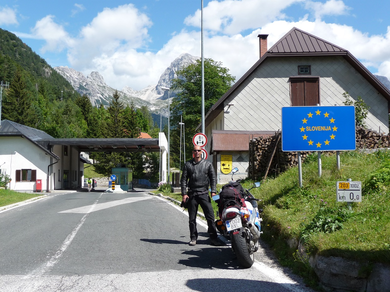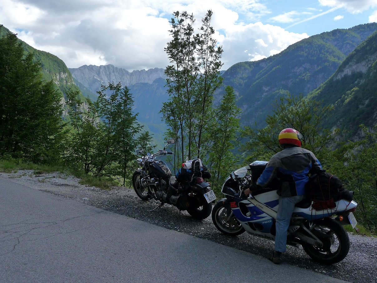 Y en un par de km más, llegamos a la frontera con Eslovenia, en lo alto del puerto de Predil. A partir de aquí entramos en el parque nacional del Triglav, con carreteras maravillosas y solitarias para rodar en moto. Al poco de entrar en Eslovenia, paramos en un sitio muy chulo en mitad de la carretera, para comer (foto de abajo a la derecha). Aquí además son otros precios, y podemos darnos banquetes que en Austria, y no digamos en Suiza, no podíamos.