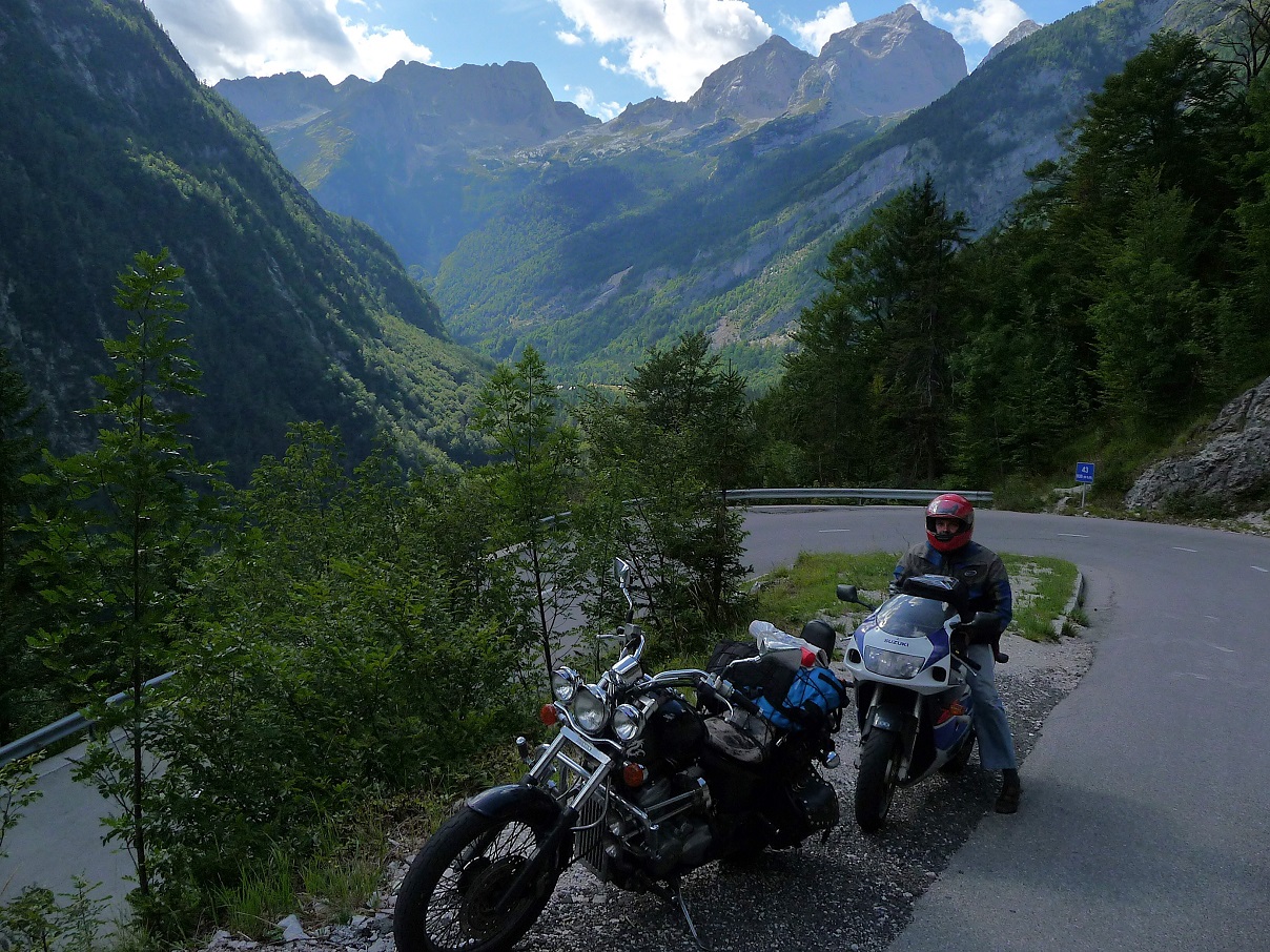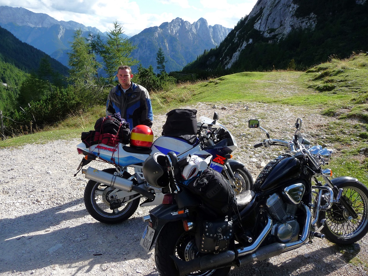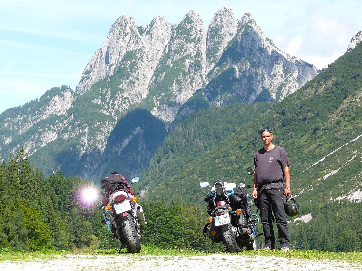 Y en un par de km más, llegamos a la frontera con Eslovenia, en lo alto del puerto de Predil. A partir de aquí entramos en el parque nacional del Triglav, con carreteras maravillosas y solitarias para rodar en moto. Al poco de entrar en Eslovenia, paramos en un sitio muy chulo en mitad de la carretera, para comer (foto de abajo a la derecha). Aquí además son otros precios, y podemos darnos banquetes que en Austria, y no digamos en Suiza, no podíamos.