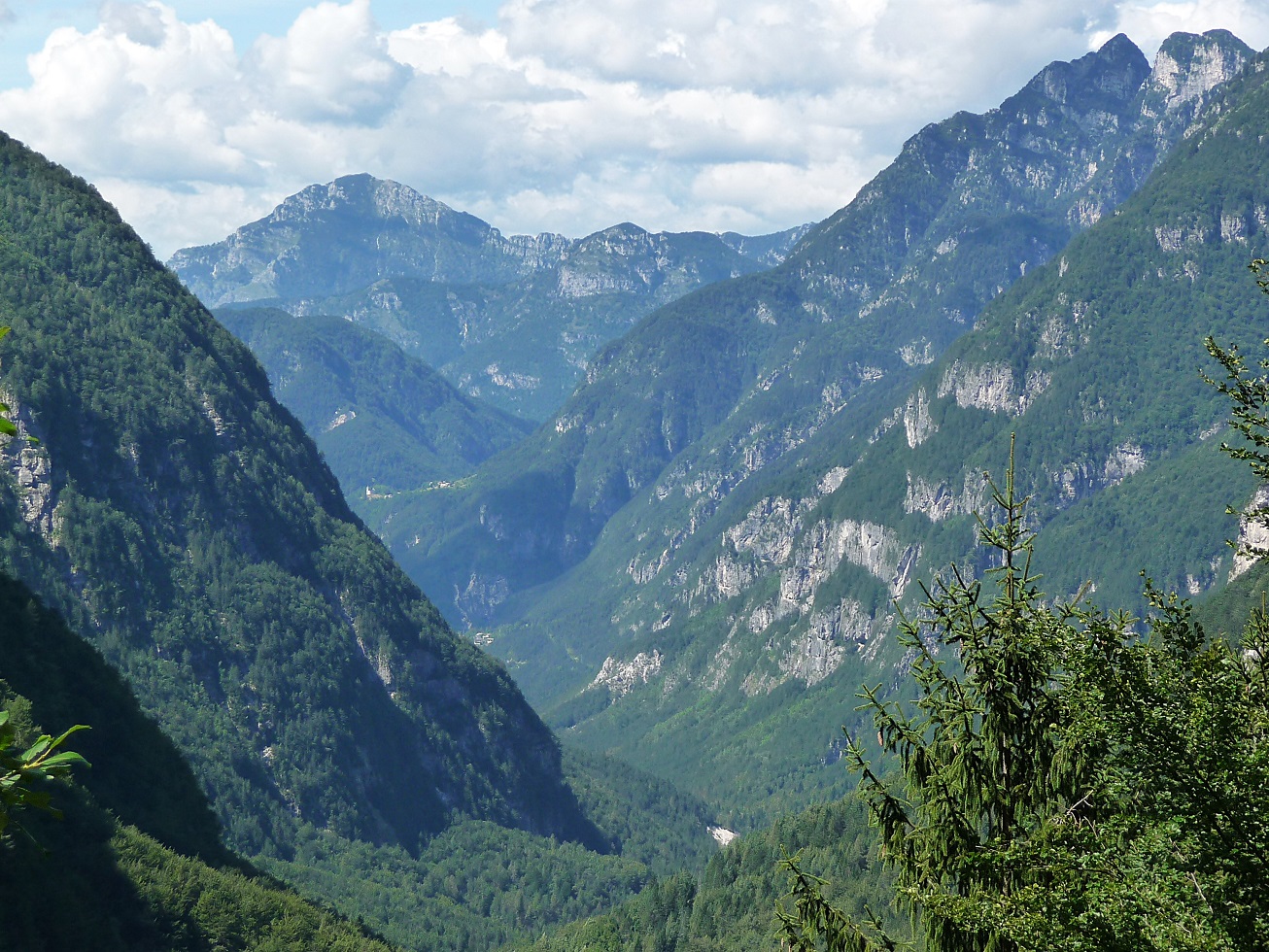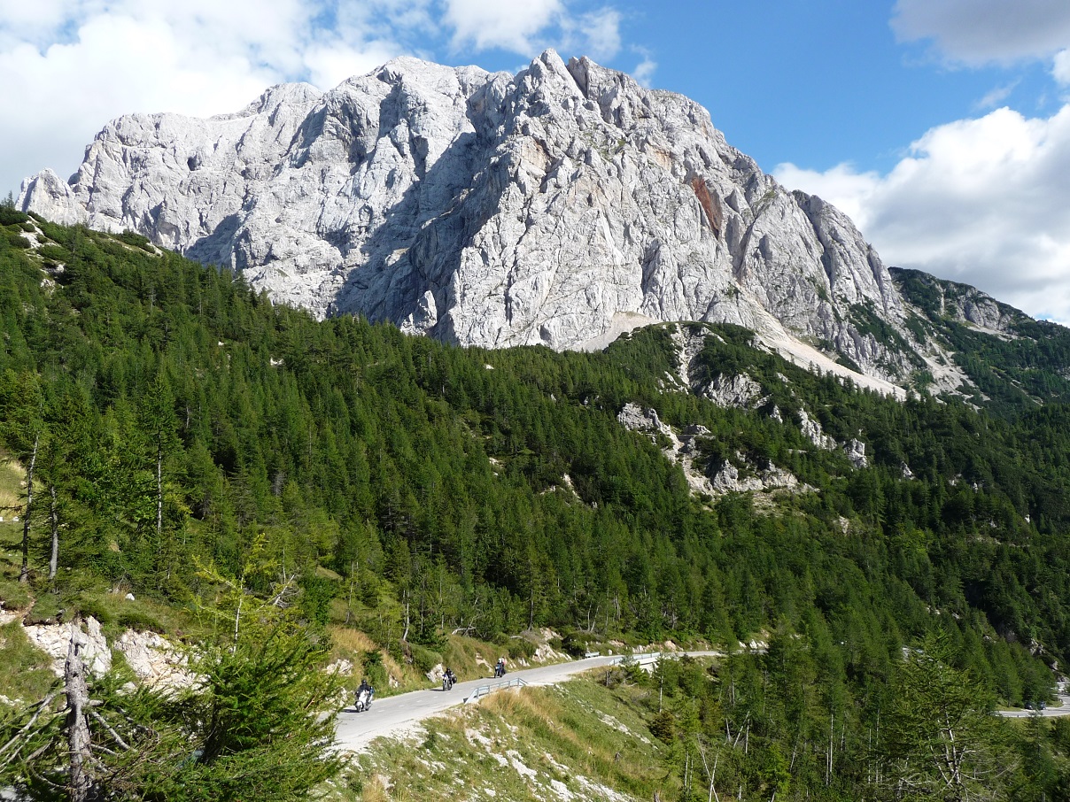 El plan para la tarde es recorrer todo el parque nacional del Triglav, pasando su principal puerto, el de Vrsic, de 1611 metros de altura, que es el puerto de montaña más alto de Eslovenia. Abajo podéis ver algunas fotos de esta ruta que hicimos por el Triglav, que mantiene un paisaje similar al que habíamos recorrido poco antes en Italia, en la zona del lago Predil: espesos bosques de abetos, señoreados por inmensas moles de roca caliza bastante alpinas y agrestes.