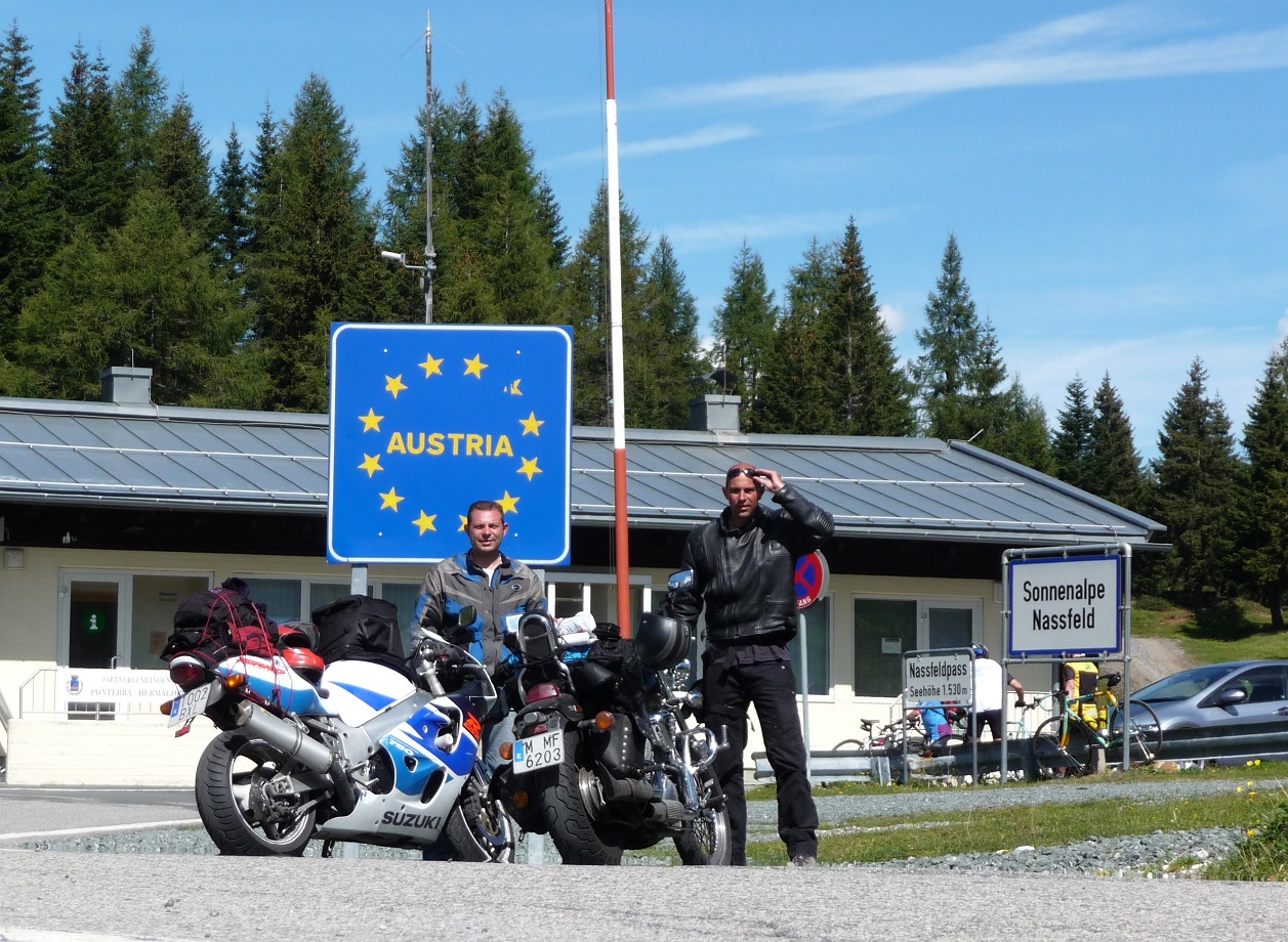 Desde Mauthen fuimos hacia el este, paralelos a la cordillera de los Alpes Cárnicos, hasta que en Tropoloach giramos a la derecha, comenzando la subida del magnífico puerto Nassfeldpass (en Italia, Passo di Pramollo), de 1530 metros de altura, que hace de frontera entre Austria e Italia. Abajo podéis ver un par de fotos en la cima de este puerto.