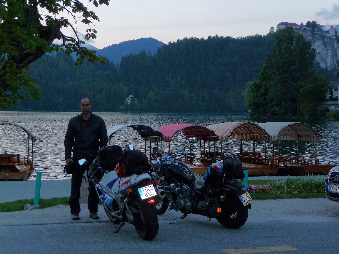 Y llegamos al lago de Bled, donde íbamos a dormir. Resultó ser un lago mucho más turístico de lo que imaginaba, por las fotos que había visto. Está bastante urbanizado, y hay mucha gente, no es el sitio solitario y misterioso que muchas de las fotos que encuentras en internet quieren trasmitir. Nos tomamos una cerveza en una terraza cercana a la orilla. Cerca del lago de Bled hay una localidad con más encanto y un casco histórico bonito, Radovljica, pero no encontramos un alojamiento barato, así que decidimos dormir en Bled, donde fue sencillo encontrar habitación barata en uno de los numerosos "sobe" que hay allí.