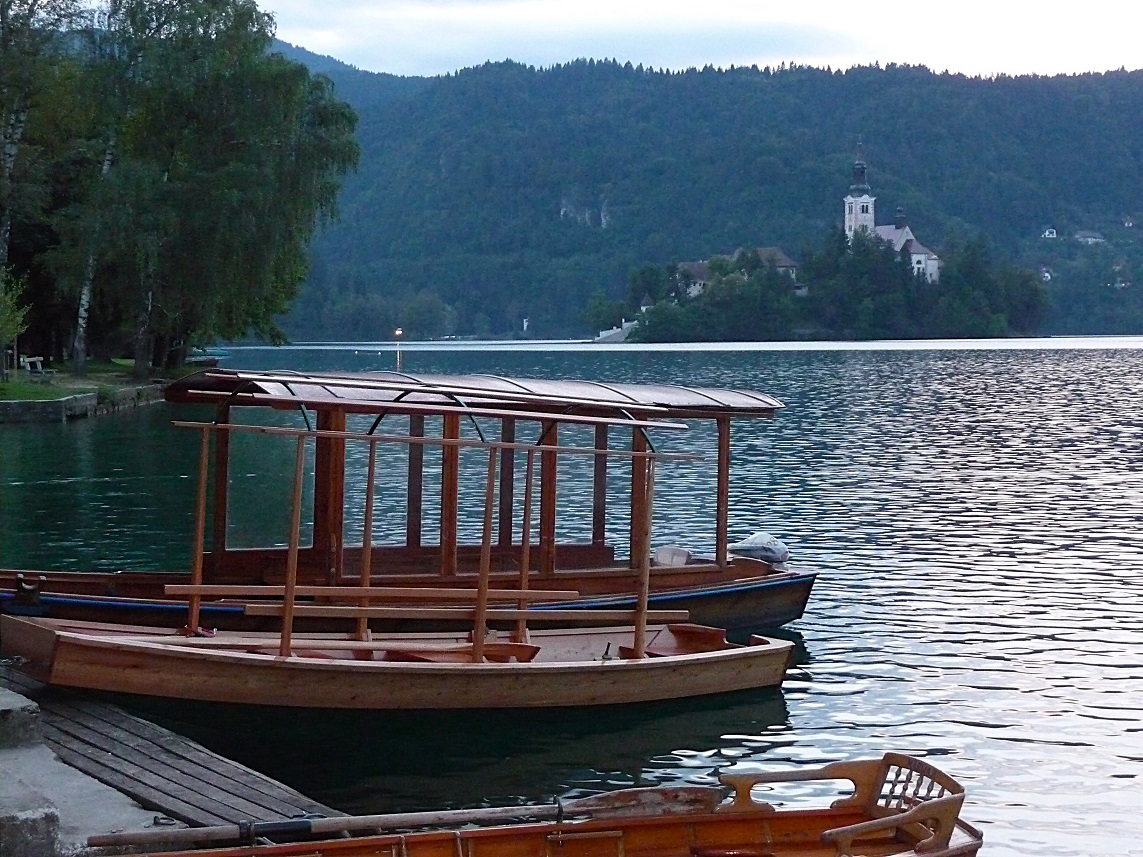 Arriba a la derecha, la famosa isla con su iglesia que está en el centro del lago, y las barcas que se alquilan para ir hasta allí. Cenamos en un restaurante con terraza a la orilla del lago, y allí mismo tomamos unas cervezas después antes de irnos a dormir.