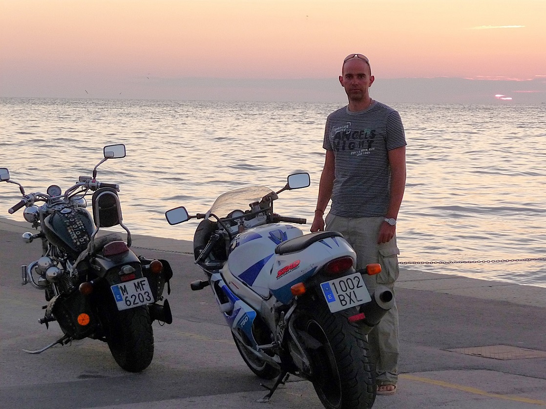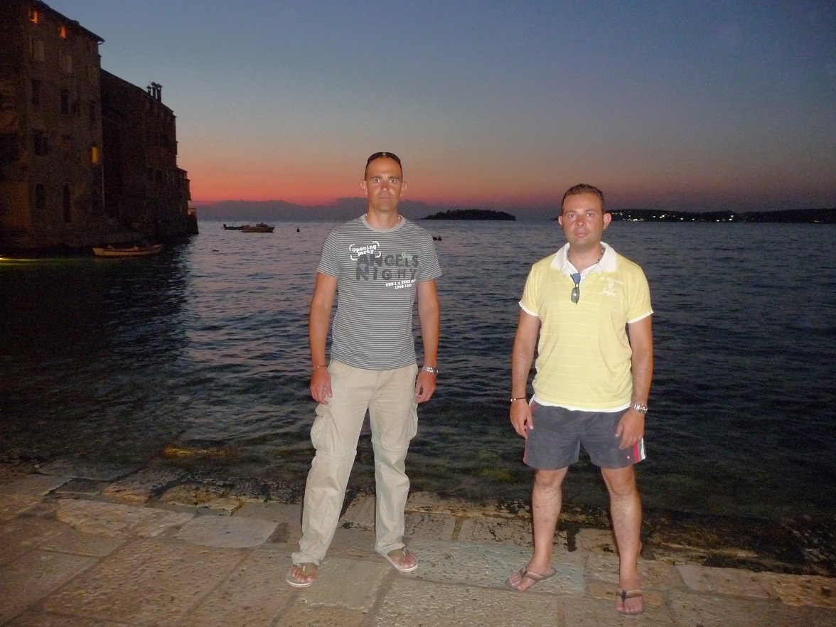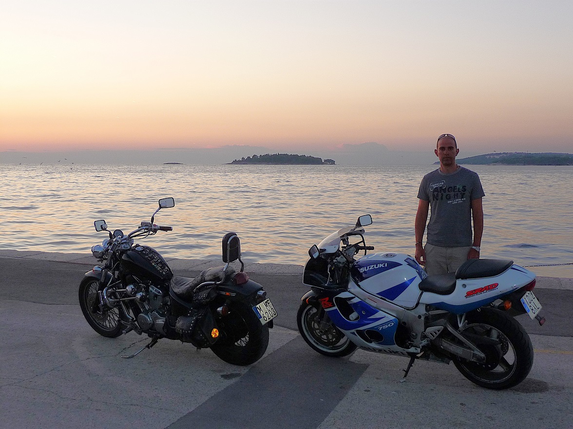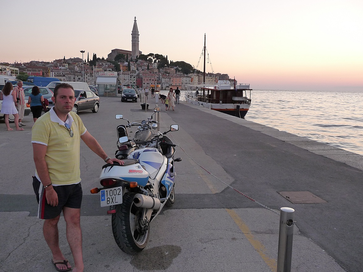 Y desde la frontera, por una carretera comarcal de buen asfalto, con un paisaje muy agradable y muy mediterráneo, fuimos hasta Rovinj, nuestro destino final. Seguramente el pueblo más bonito de toda la península de Istria, y el punto más alejado de casa al que llegamos en este viaje. Cogimos una habitación en un hostal a las afueras del pueblo (el interior es peatonal) y después de instalarnos, nos acercamos con las motos hasta lo más cerca que pudimos llegar .