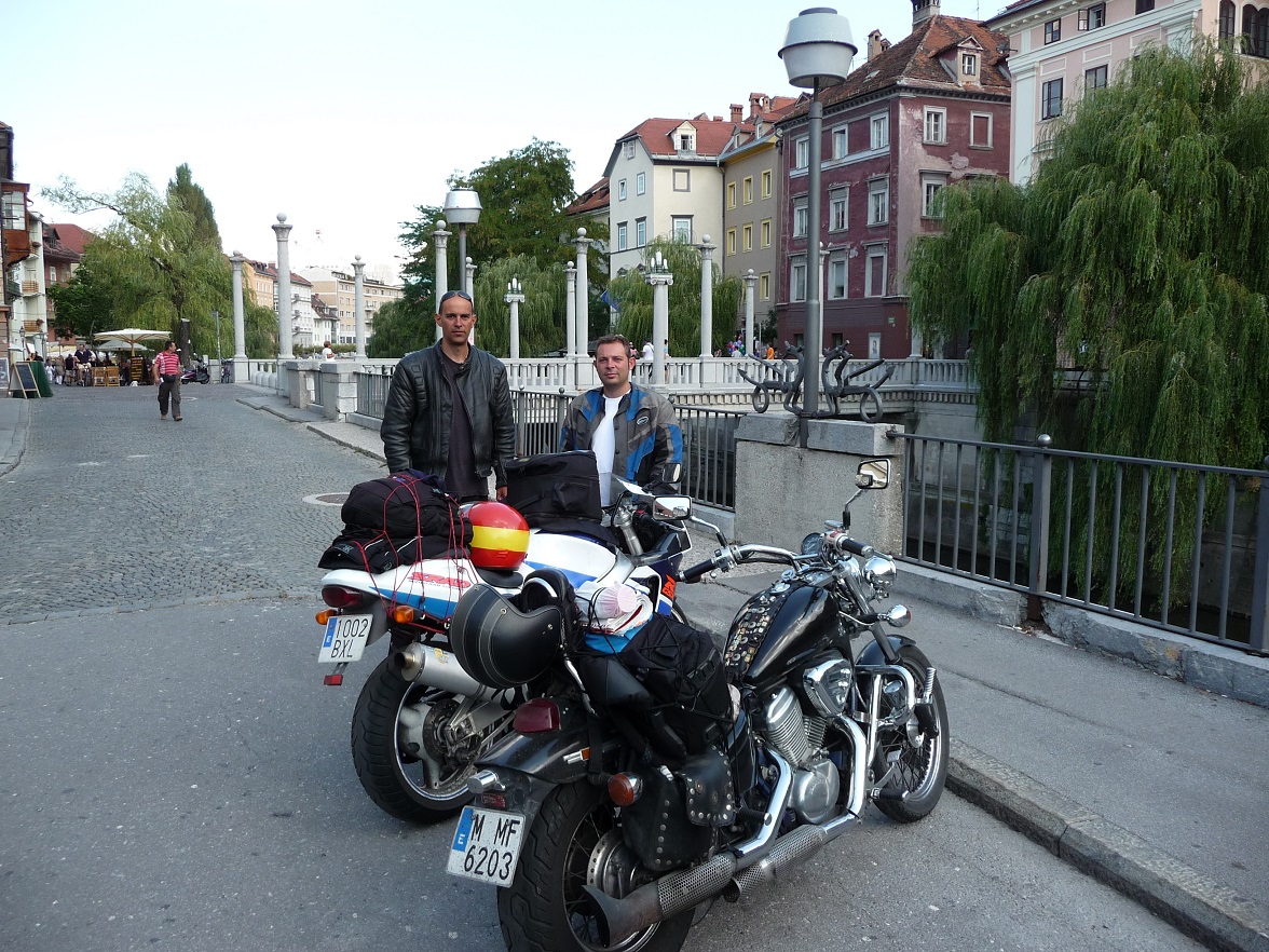 De esta manera, desde el lago Bled pusimos rumbo a Liubliana, la bonita capital de Eslovenia, donde hicimos una parada para tomar una cerveza y dar un paseo. Fuimos con las motos hasta el mismo centro histórico, y las dejamos junto a una fantástica terraza sombreada a la orilla del rio Ljubljanica, que atraviesa el centro de la ciudad. Las fotos de abajo son de nuestra parada en Liubliana.