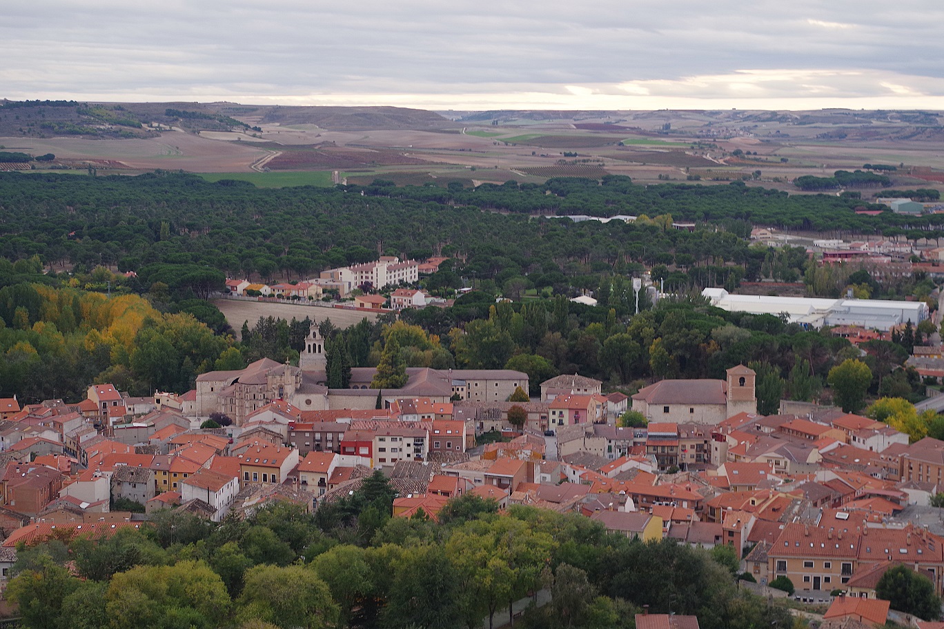 Desde aquí, seguimos ruta hasta el bonito pueblo de Peñafiel, ya en Valladolid. Está a 55 km de distancia por la ruta más directa, la carretera comarcal segoviana que pasa por Sacramenia. Llegamos ya con poca luz, no hay que olvidar que es octubre. Fuimos directamente hasta lo alto de la colina donde está el castillo, que actualmente es un museo sobre el vino. Desde allí hay una estupenda vista del pueblo a nuestros pies, ya con las últimas luces del día.