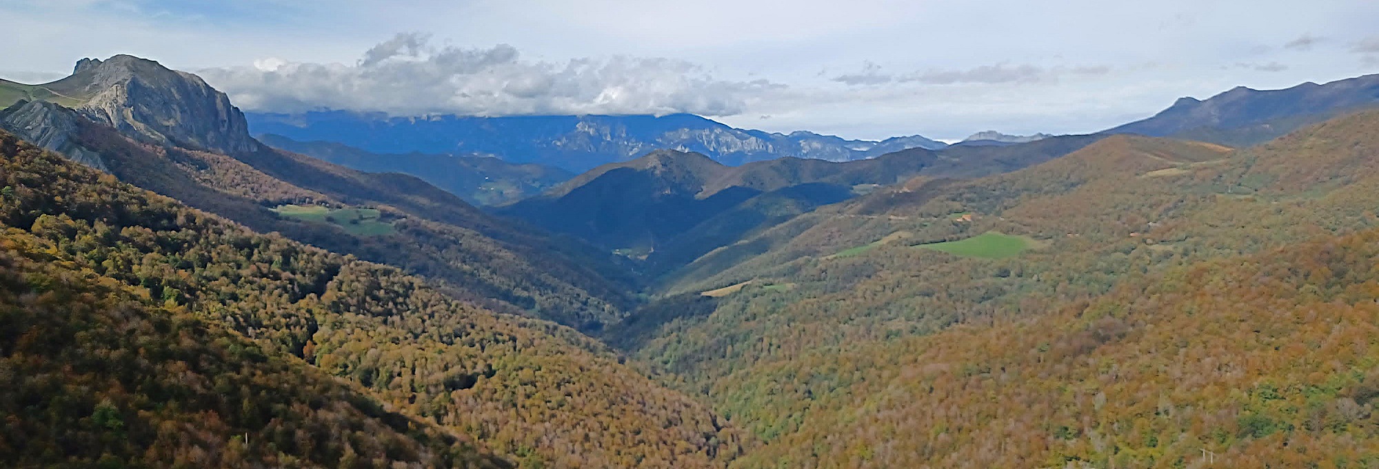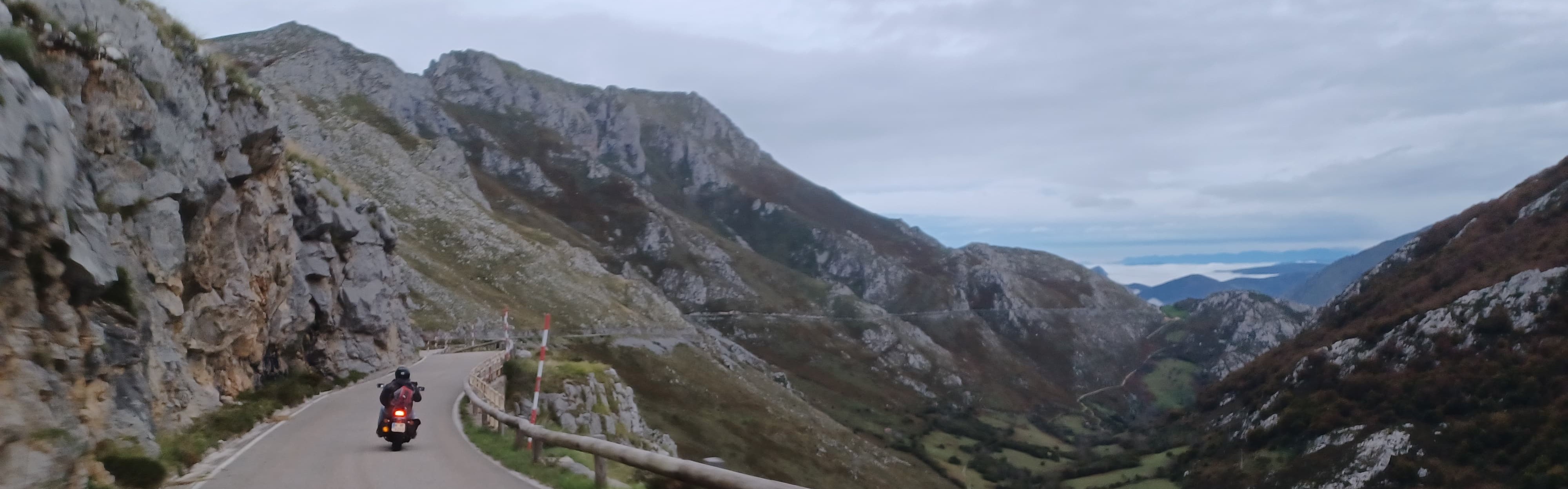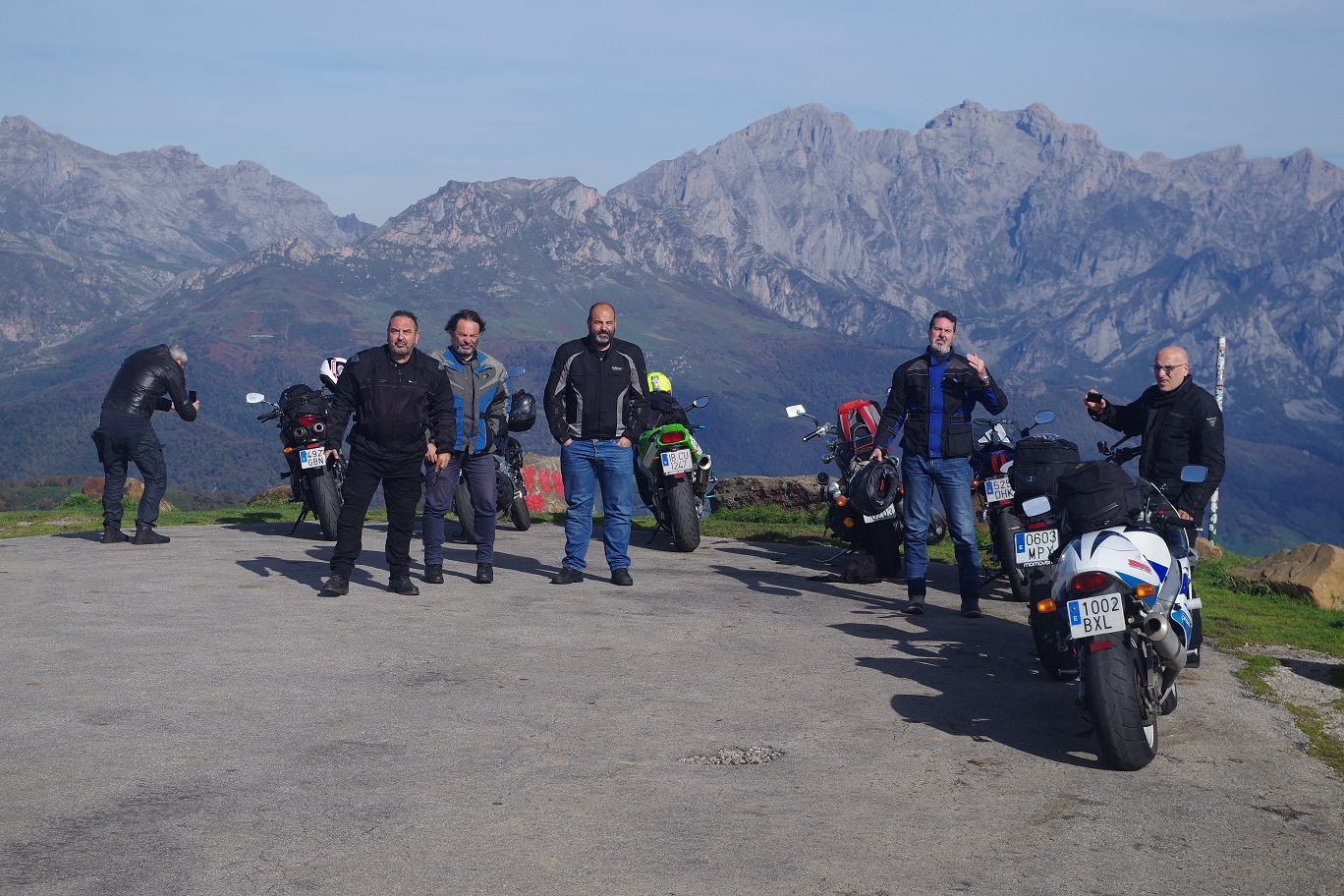 Desde el parador volvimos a Cervera, para coger la carretera que nos lleva a Cantabria pasando por el puerto de Piedrasluengas, todo un clásico en las rutas moteras en la cordillera Cantábrica. Al llegar a la cima, hicimos una parada para contemplar las vistas desde el mirador que hay en el puerto. Desde aquí hay unas vistas magníficas de los picos de Europa al fondo, y los inmensos bosques de robles que se extienden a nuestros pies, que ahora en pleno mes de octubre tienen unos colores espectaculares.