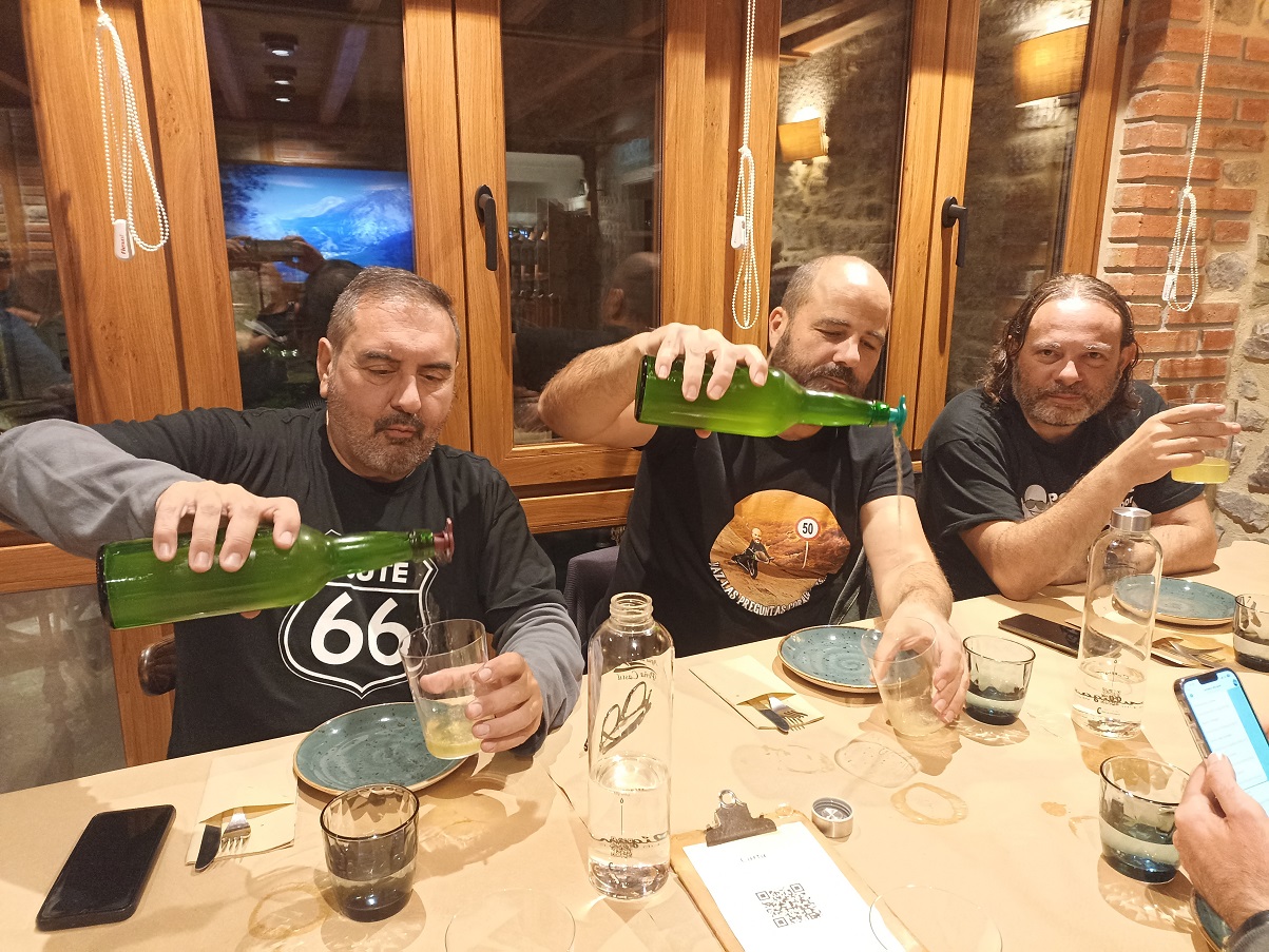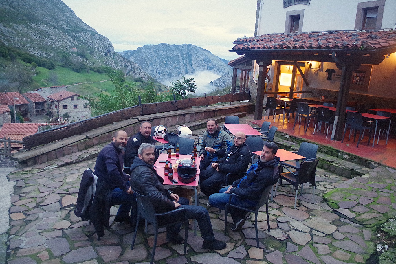En el camino de vuelta a Sotres incluso nos llovió un poco, pero poca cosa. Nos instalamos en el hostal que teníamos reservado desde hace tiempo, y cenamos allí mismo, todo regado con unas buenas botellas de sidra asturiana. Después, una copa en el mismo lugar, pero tomando el fresco fuera, junto a las motos.
