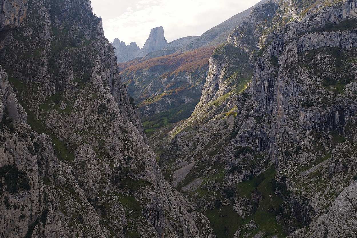 Estábamos cerca de la primera parada del día. Al llegar a Poncebos, en vez de seguir hacia Arenas de Cabrales, cruzamos el rio Cares y subimos hacia el mirador de Camarmeña, por una carretera endiabladamente revirada y con un desnivel tremendo. Una vez arriba, tuvimos nuestra recompensa, una vista fabulosa del pico Urrielu, el Naranco de Bulnes. Desde allí se puede seguir hasta otro mirador un poco más arriba, pero ya caminando, no hay carretera.