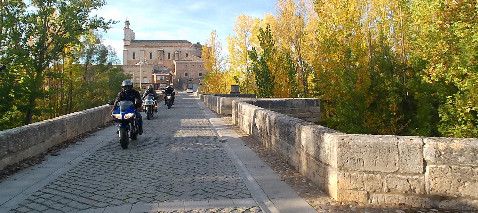 Y después de comer, como siempre, empieza la gran paliza de la vuelta a casa. Pasamos de nuevo por Torquemada, igual que a la ida dos días antes, pero esta vez de día. En la foto de abajo, pasando por el monumental puente de piedra que lleva a Torquemada, con su gran iglesia al fondo.