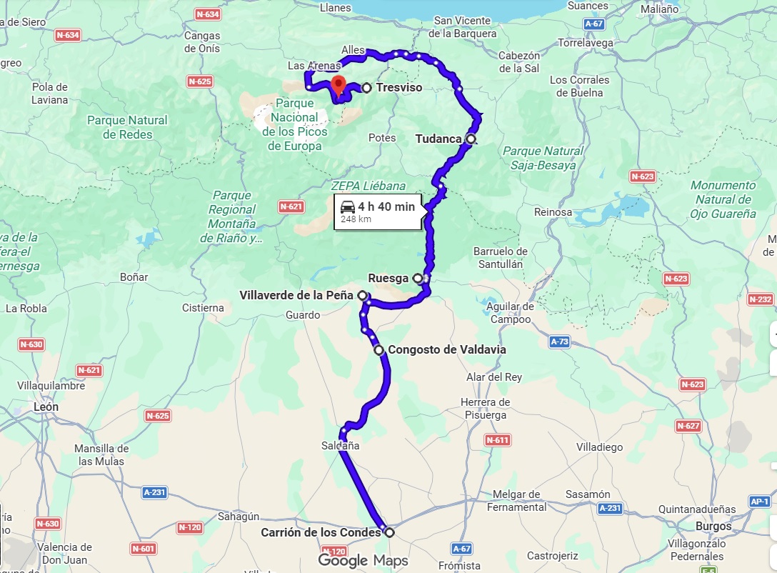 - Día 2: Desde Carrión de los Condes hasta Sotres, parando en Villaverde de la Peña, Ruesga, parador de Cervera de Pisuerga, puerto de Piedrasluengas, Pejanda, Tudanca y Tresviso. Unos 250 km.