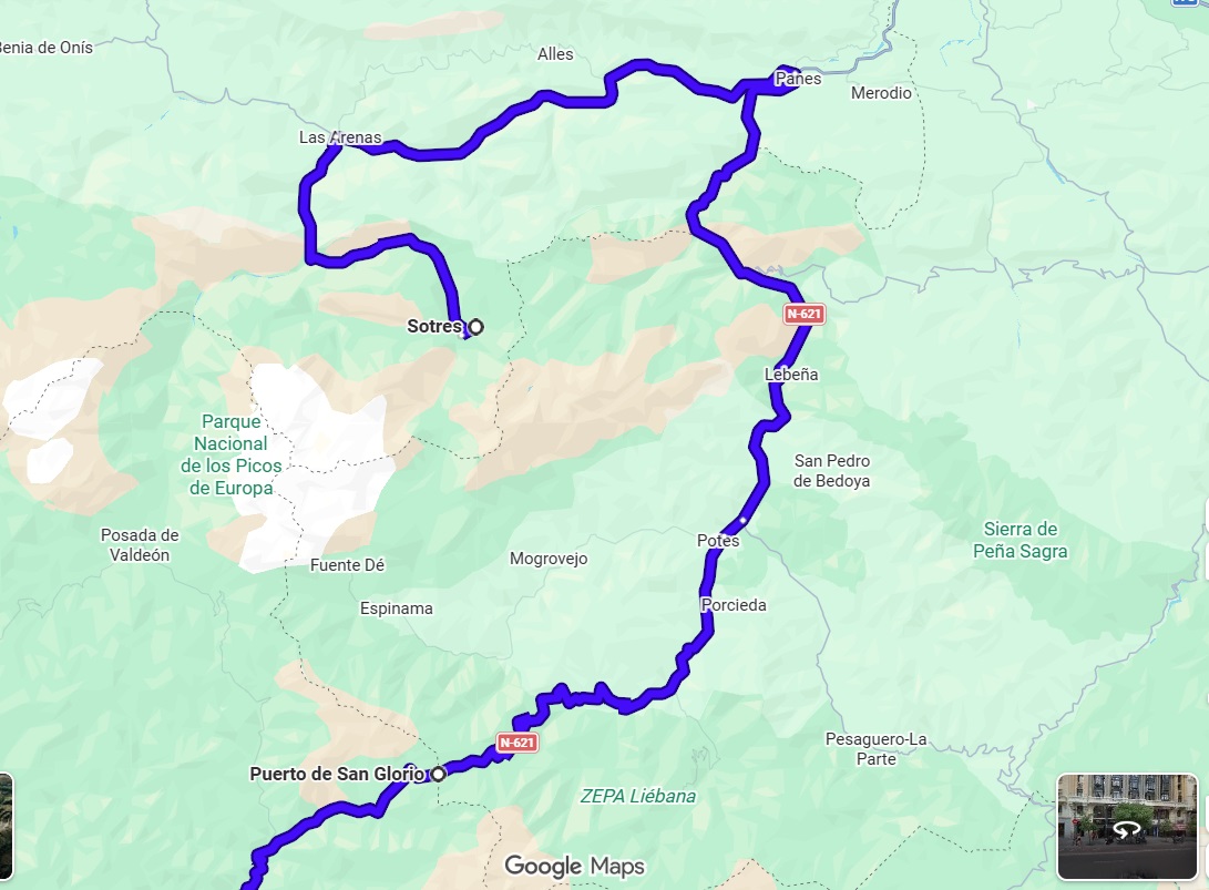 Desde Tudanca bajamos todo el valle, pasando por Puentenansa, hasta Panes, ya en Asturias, donde paramos a llenar depósitos. Y desde allí, por una carretera con buen paisaje y mejor asfalto, un tramo divertido de conducir para quien le gusta las curvas con buen asfalto, llegamos a Arenas de Cabrales, la auténtica puerta norte a los Picos de Europa. Desde Tudanca habíamos hecho unos 62 km.