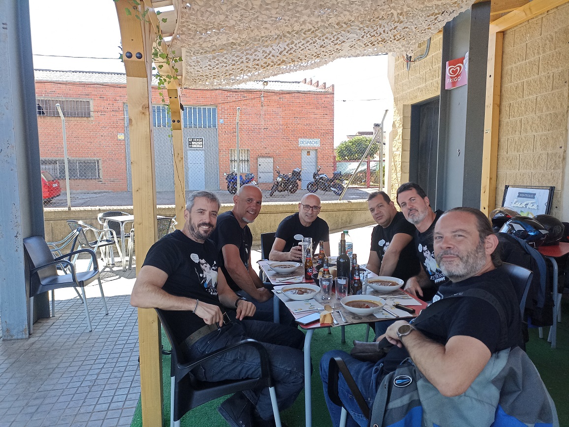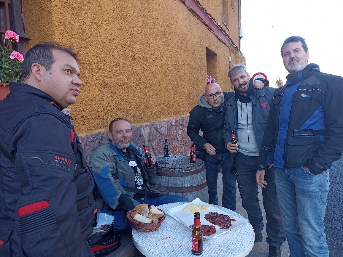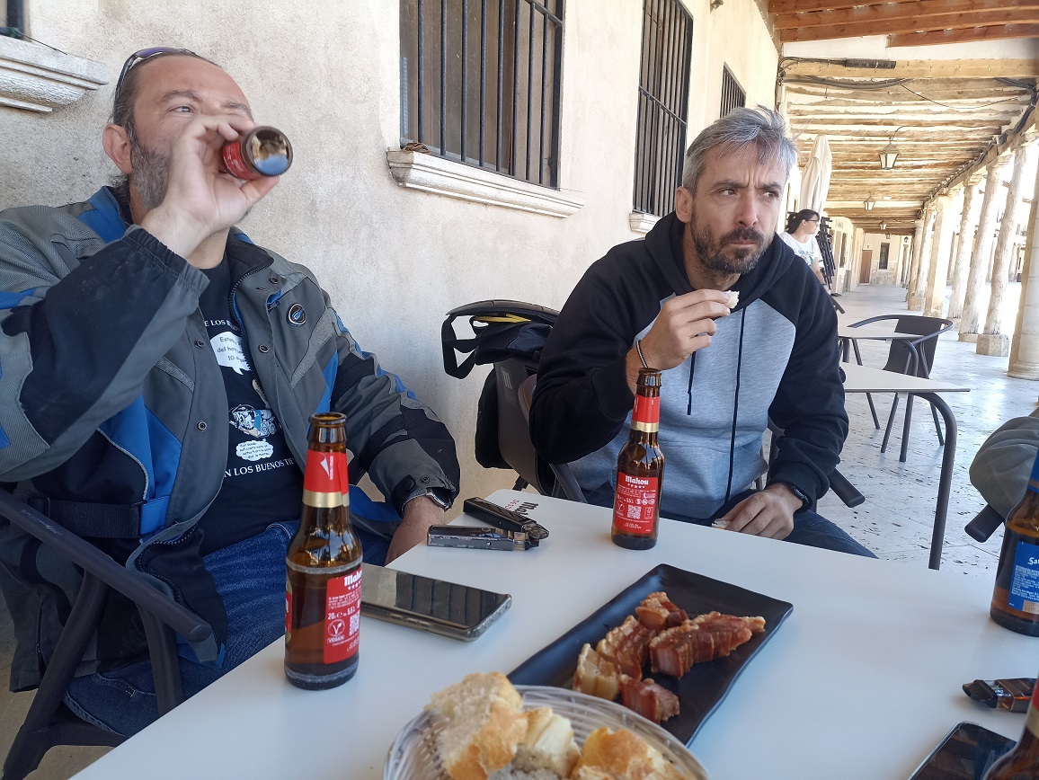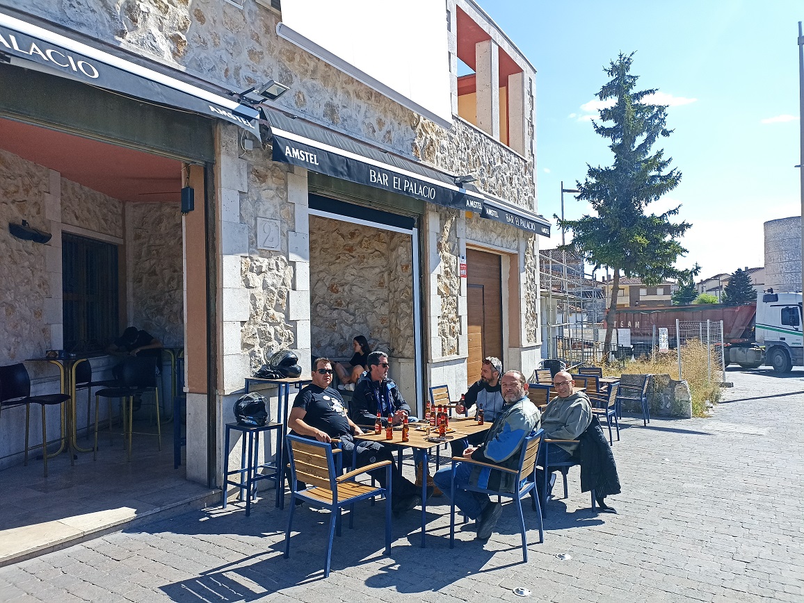 Solo íbamos a hacer en todo el día un pequeño tramo de autovía, e iba a ser justo al principio, hasta el desvio a Cuéllar que hay pasado el puerto de Somosierra. La primera parada fue justamente en el restaurante que hay en la cima del puerto, para desayunar unos magníficos pinchos de tortilla. Abajo a la izquierda, en la gasolinera de Cotos, y a la derecha, en el bar de Somosierra.