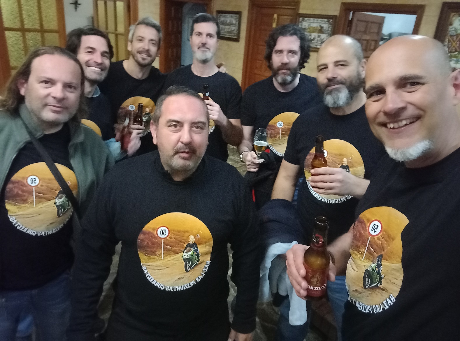 Este viaje era hacia el sur, así que no quedamos en nuestro sitio habitual, que es la gasolinera de Cotos de Monterrey en la A-1, sino en la gasolinera que está cerca del centro comercial Nassica, en la A-4. Allí, una vez nos juntamos todos, repartimos las camisetas que habíamos hecho por el 50 cumpleaños de Darío.