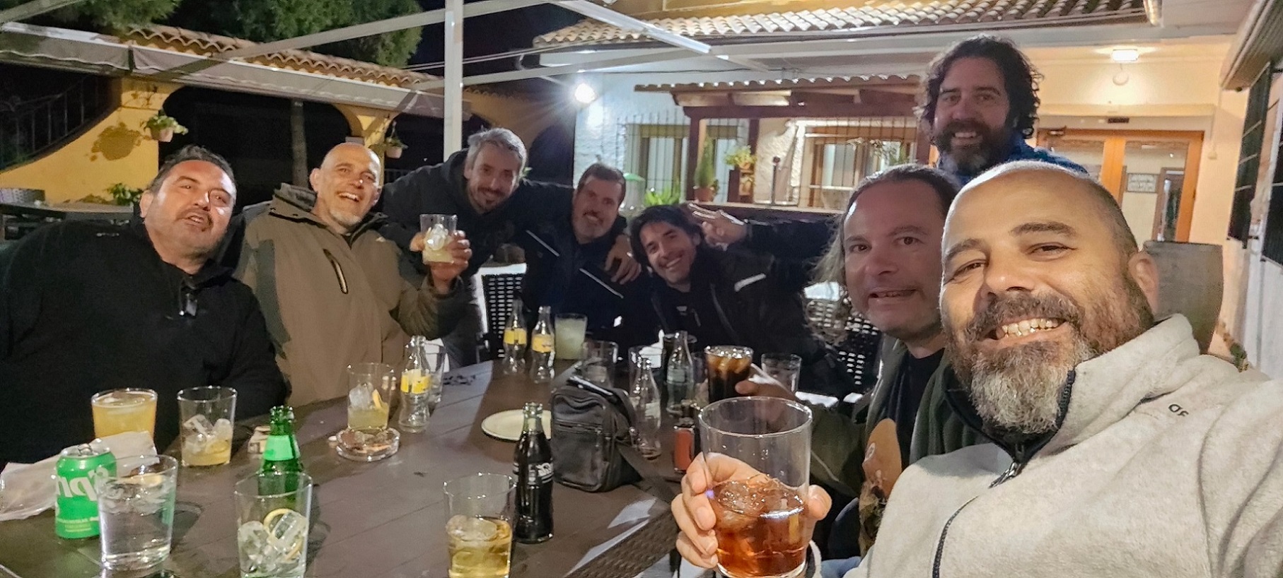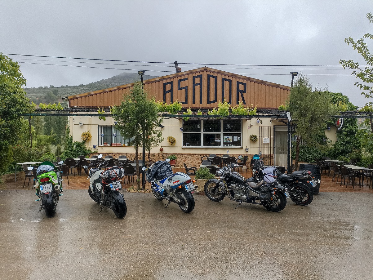 La verdad es que nos mojamos bastante, así que aguantamos allí hasta que parecía que aclaraba de nuevo. Otra vez a las motos. Hicimos unos cuantos km sin lluvia, daba la impresión de que lo peor había pasado. Dejamos atrás Cañamares y Reolid, y entonces empezó otra vez a llover. Menos mal que esta vez, enseguida encontramos refugio. Antes de llegar al pueblo de Salobre, vimos un asador junto a la carretera, asador Los Olivos se llamaba, y allí paramos. Desde el hotel, 80 km habíamos hecho en total, mal íbamos. Tomamos otras cervezas mientras veíamos llover por los ventanales, y como no paraba, decidimos comer allí, aunque aún era temprano para eso.