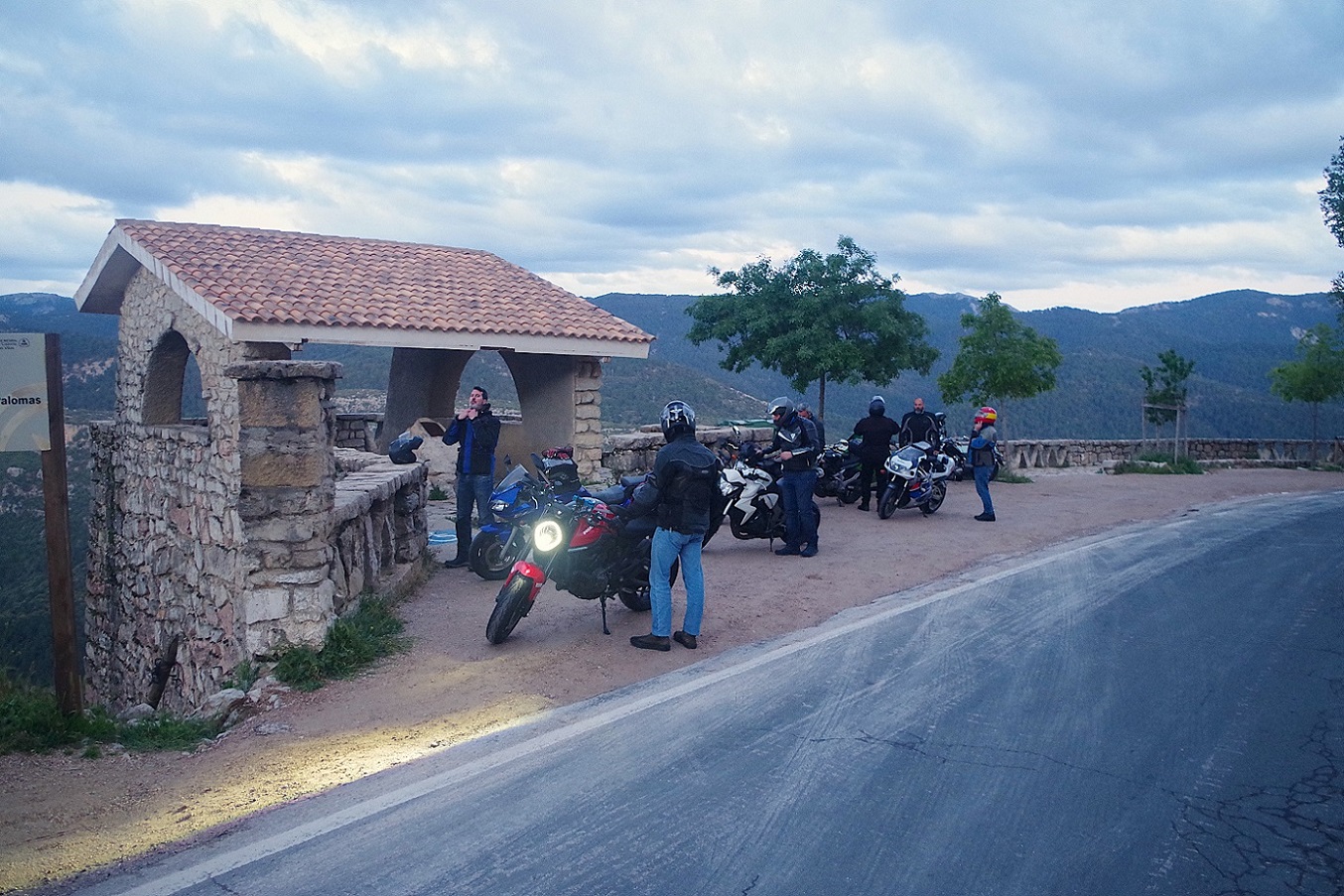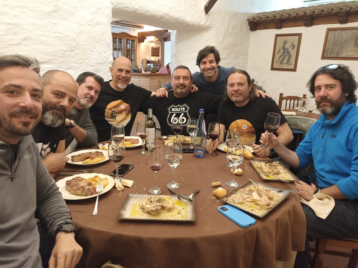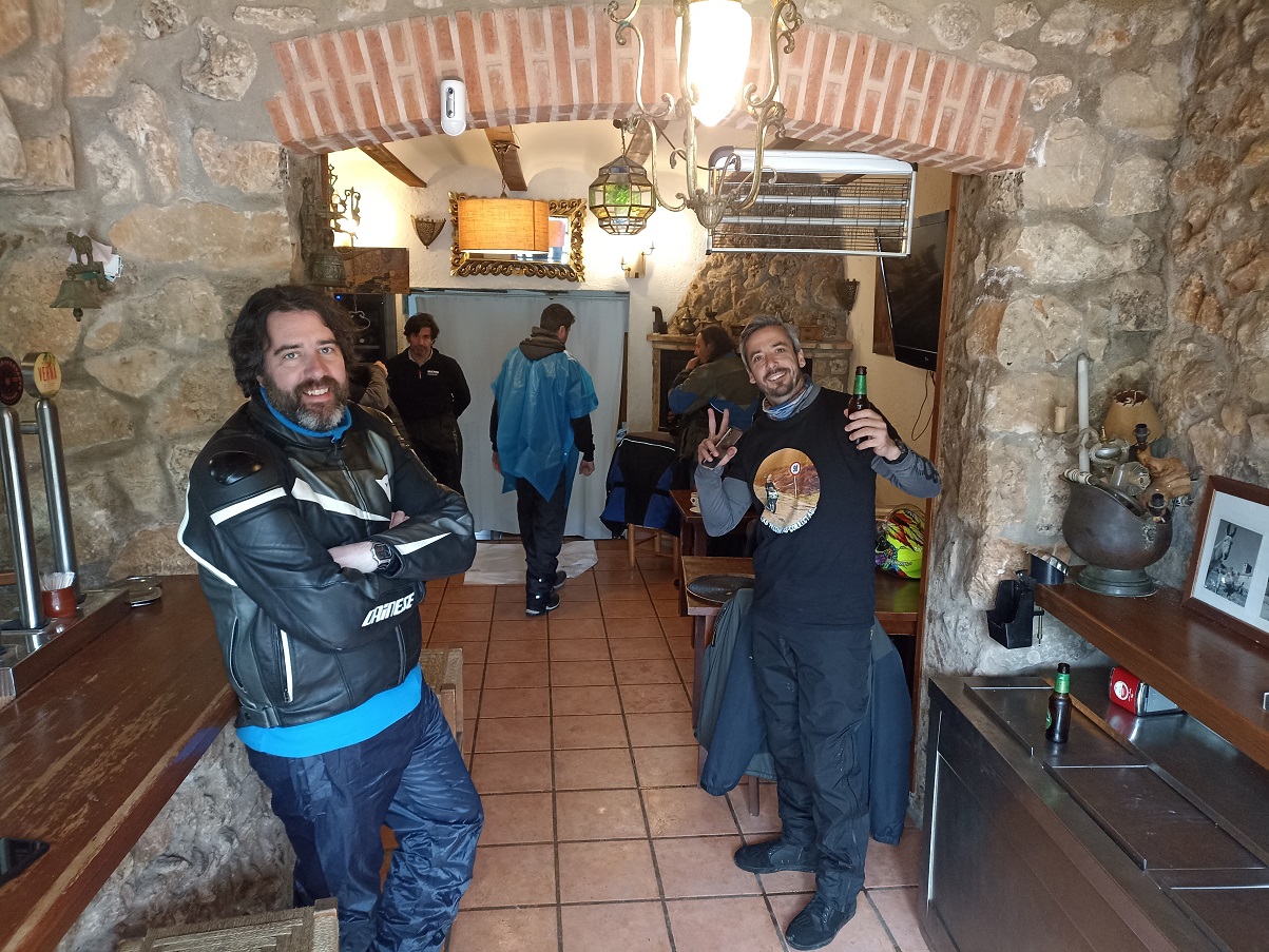La verdad es que comer allí fue todo un acierto. Pedimos carne a la brasa, que la hacían en un buen fuego de leña que tenían tras la barra, y estaba todo buenísimo. Con el frio que teníamos, fue como revivir de nuevo. Después de los cafés, paró de llover por fin, así que volvimos a las motos. Justo nada más dejar el restaurante empezaba la subida al pequeño puerto de Riopar, y cuando estábamos en la cima, más o menos, empezó a llover de nuevo. Continuamos un poco más hasta que llegamos al desvío de Riopar Viejo, una antigua aldea situada en lo alto de una colina. Allí teníamos otra taberna esperándonos para darnos cobijo, y casualmente coincidimos con otros moteros, aunque se fueron antes que nosotros.