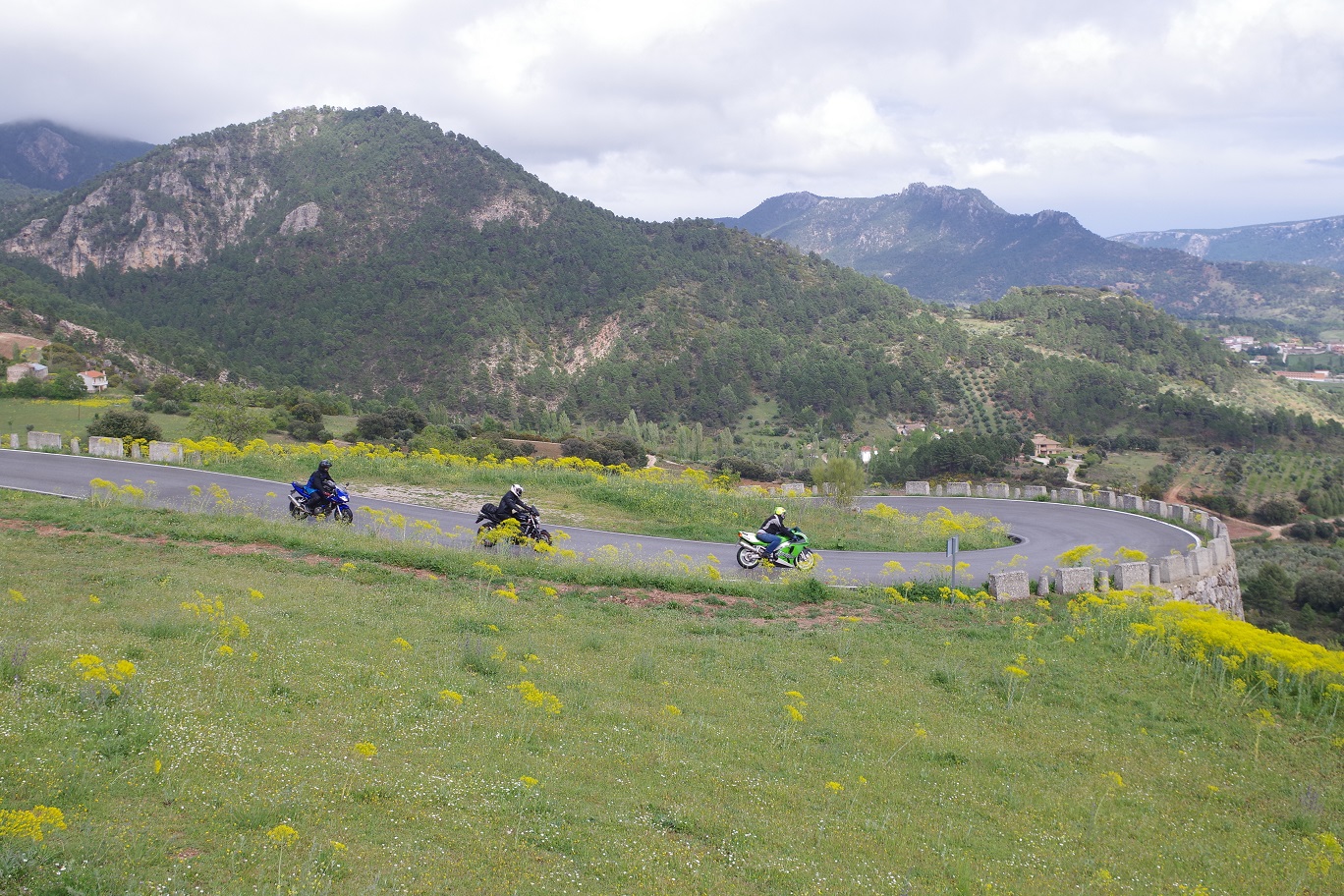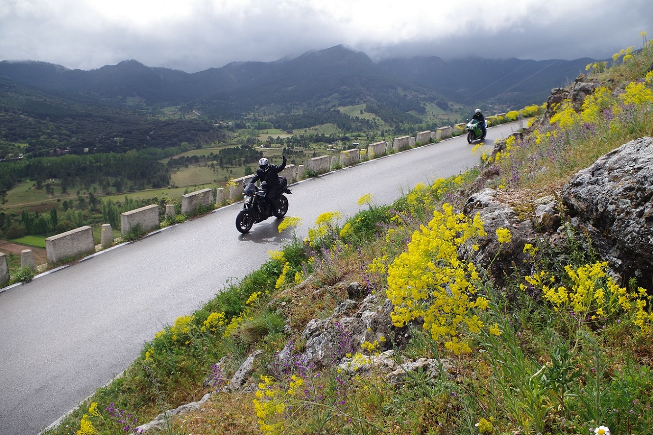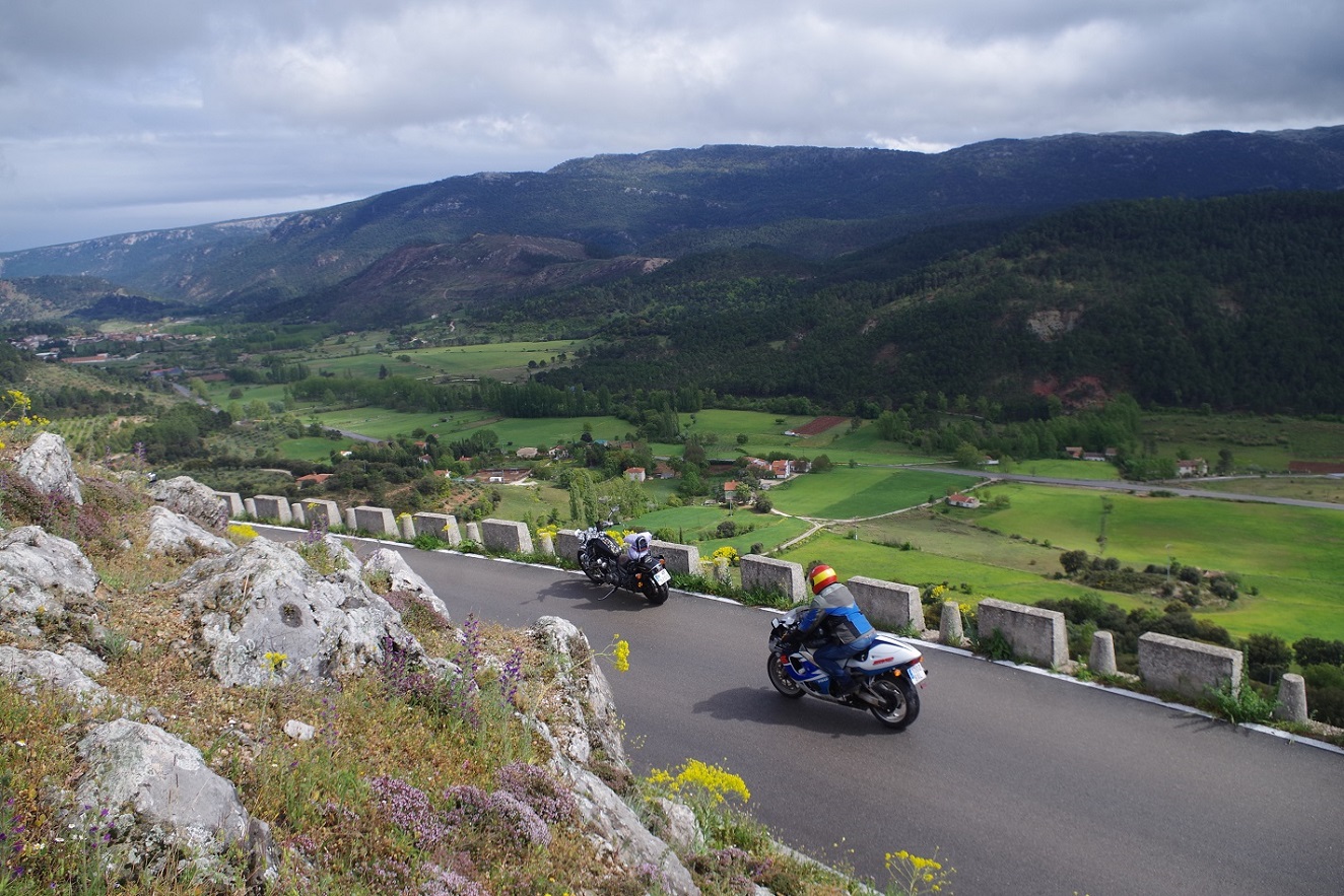Y de nuevo dejó de llover. Esta vez sí que parecía que iba más en serio, ya que incluso se empezó a ver tímidamente el sol. De nuevo a las motos, había que aprovechar. Estábamos ya muy cerca de la entrada a la sierra de Cazorla, Segura y las Villas, que teníamos que atravesar completamente de norte a sur para llegar al alojamiento que teníamos reservado. Abajo, fotos bajando desde Riopar Viejo hacia el valle.