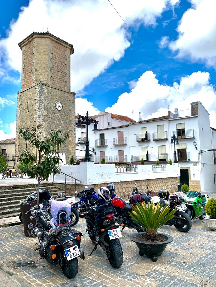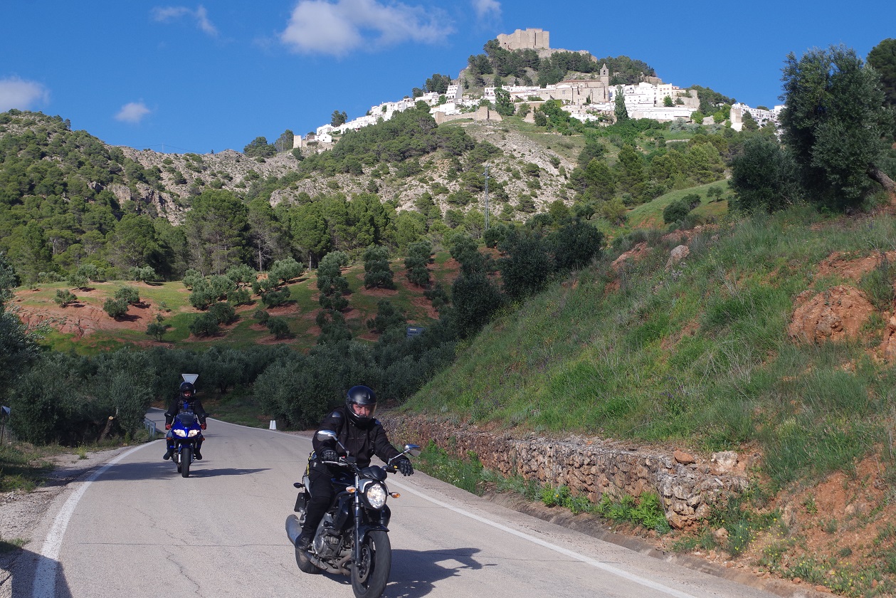 Desde el mirador ya estábamos solo a 14 km de nuestro destino final del día, el pueblo de Cazorla, donde habíamos reservado en el albergue, situado en una casona señorial antigua. Antes, pasamos por La Iruela, un pueblo más pequeño que también habría sido una muy buena opción para dormir. Lo cierto es que Cazorla no nos gustó mucho, demasiado grande para nosotros, que nos suele gustar dormir en pueblos más pequeños. Aparcar las motos en el centro, en la zona de callejuelas donde está el albergue, fue complicado.