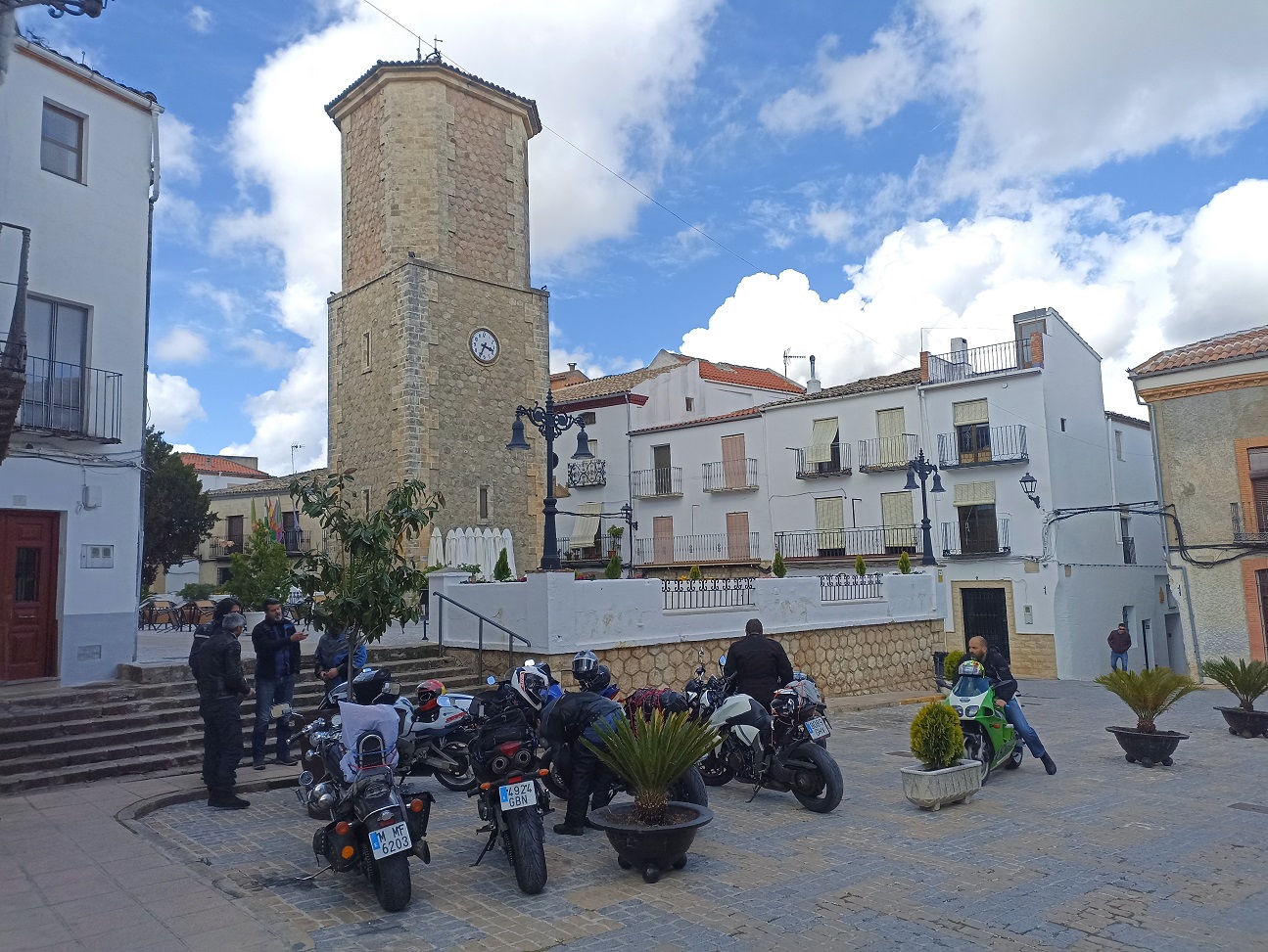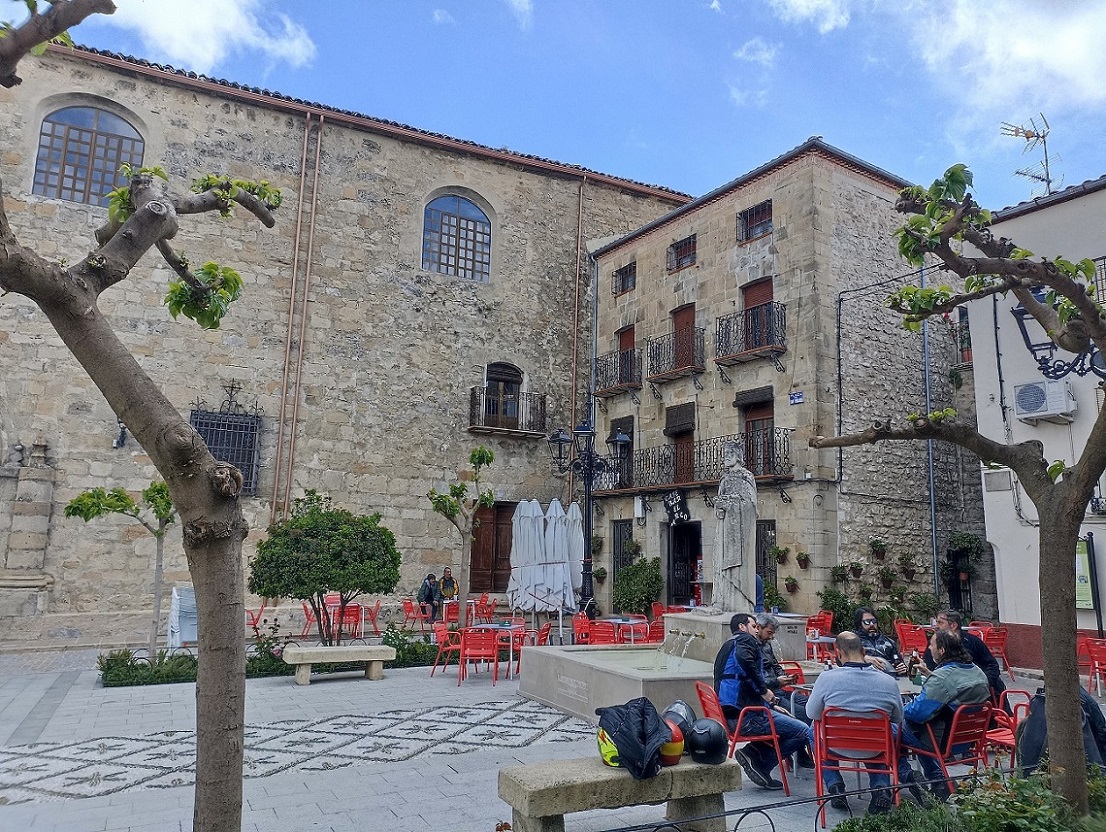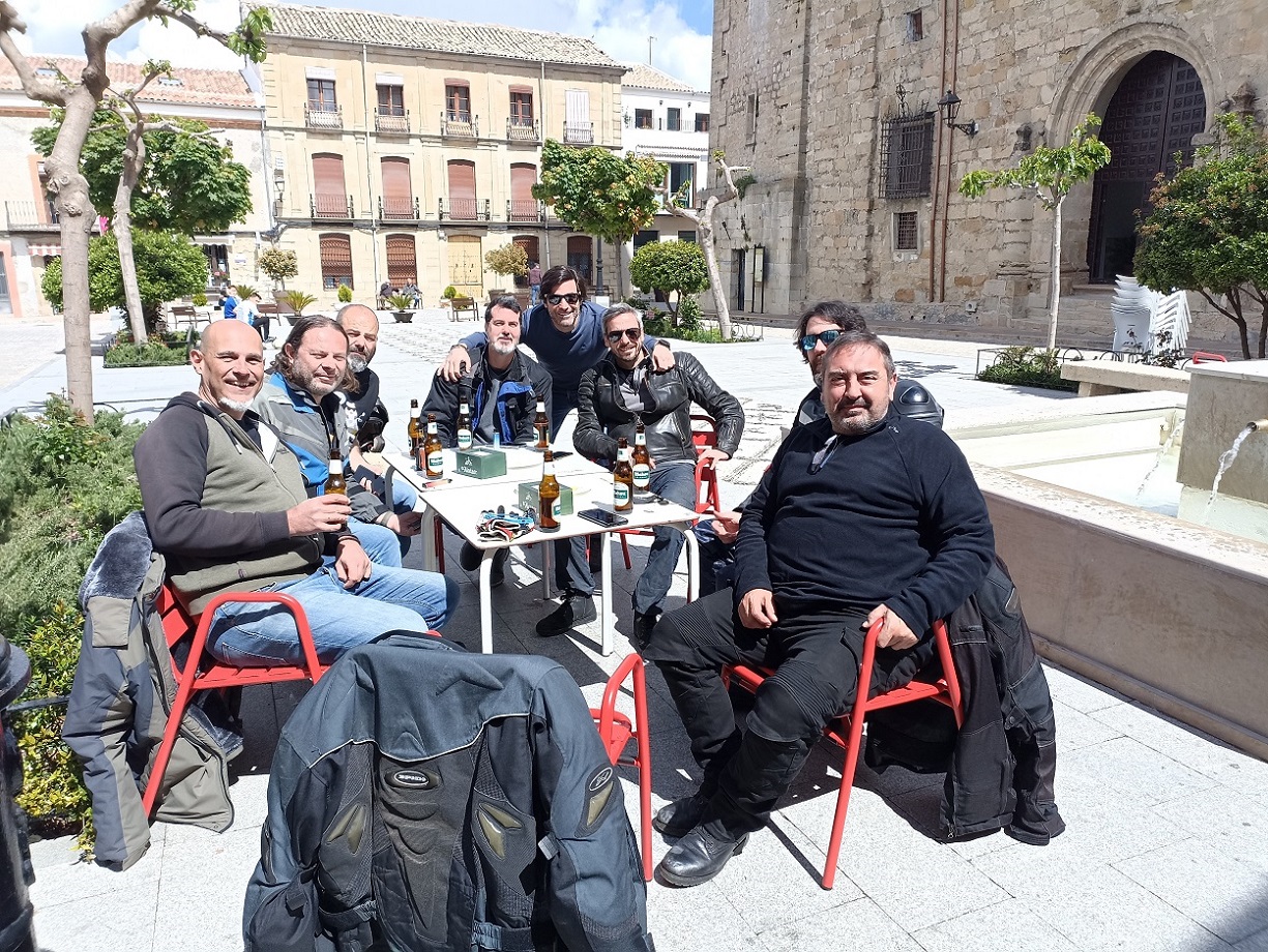 Nos metimos con las motos por unas callejuelas realmente estrechas, hasta que al pasar por un arco, salimos a una bonita plaza presidida por la iglesia, donde una fantástica terraza nos estaba esperando con los brazos abiertos. Ya teníamos una mesa preparada y todo, como si nos estuviesen esperando. Allí cayeron las primeras cervezas del día, y fue un rato muy agradable.