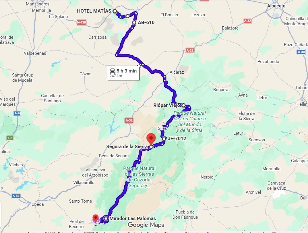- Día 2: Desde las lagunas de Ruidera hasta Cazorla, parando en Villahermosa, Riopar Viejo, Segura de la Sierra y puerto de Las Palomas. Unos 250 km.
