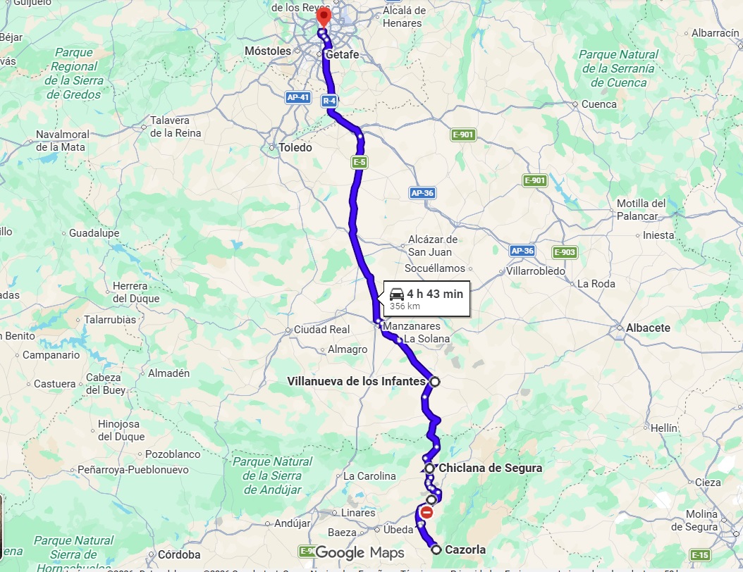 - Día 3: Desde Cazorla hasta Madrid, parando en Iznatoraf, Chiclana de Segura, Sierra Morena y Villanueva de los Infantes para comer. Unos 360 km.