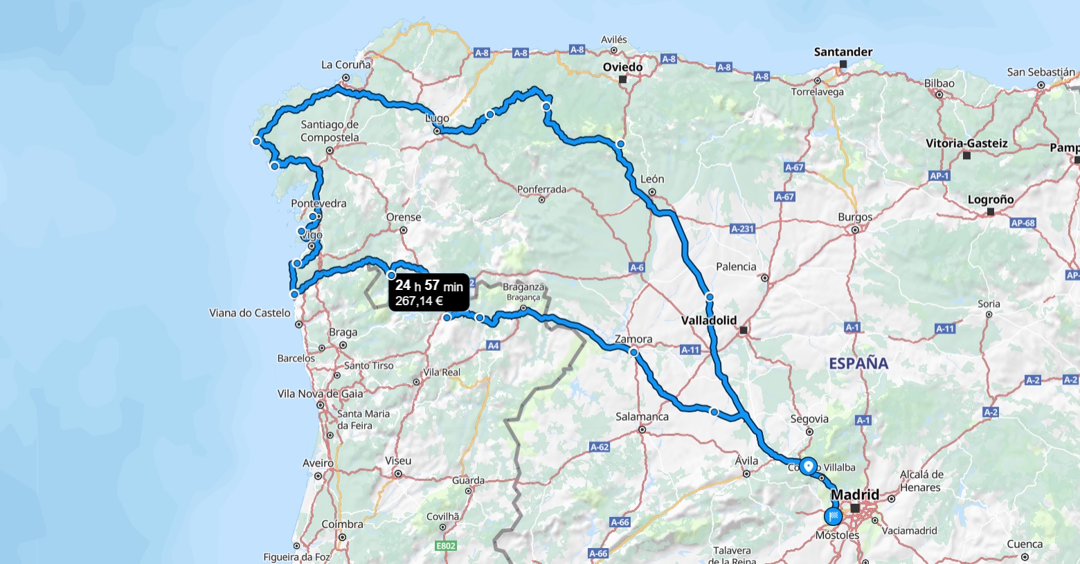 Para ir lo más rectos posibles, atravesamos por Portugal, parando en las bonitas ciudades de Bragança y Chaves y recorriendo el parque nacional de Peneda-Geres. Desde A Guarda, ya en Galicia, fuimos subiendo siempre por la costa, recorriendo las Rias Baixas, hasta llegar al objetivo final, Finisterre.