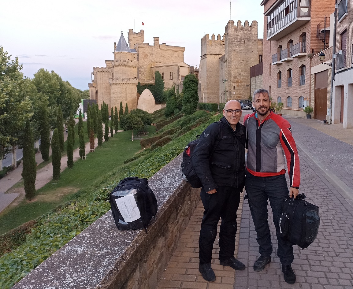Y de aquí ya no hubo tiempo para más paradas, nos habíamos entretenido mucho y aún estábamos a unos 125 km de nuestro destino. Llegamos a Olite con las últimas luces del día ya. El centro histórico es de acceso restringido, así que tuvimos que dejar las motos en la calle justo por la parte de fuera de la muralla, e ir caminando hasta el hostal, que estaba situado en la plaza del castillo de los reyes de Navarra, justo enfrente del parador nacional.