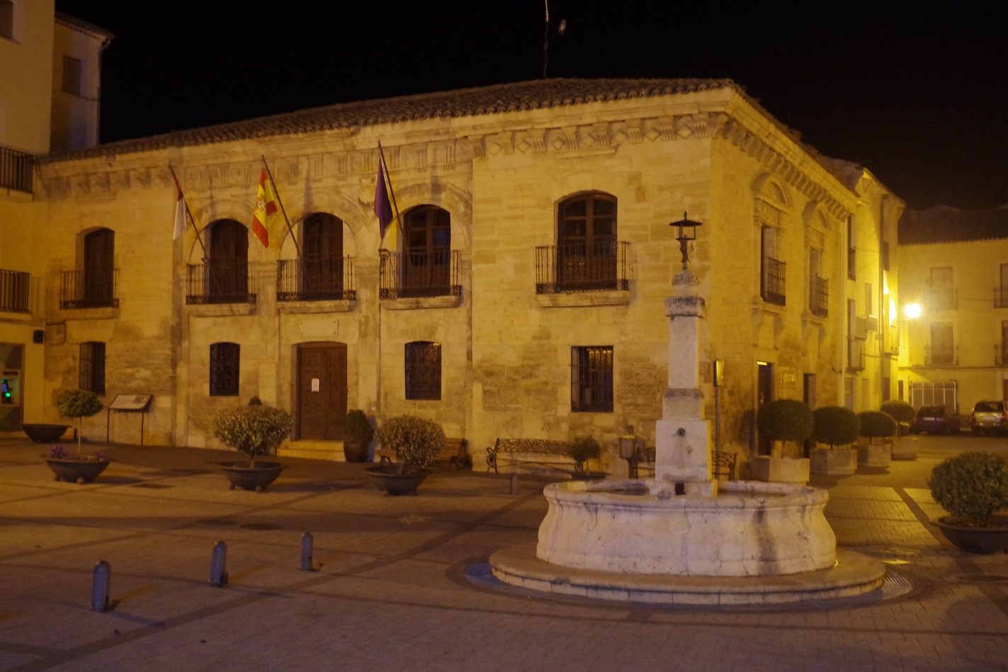 Hicimos la siguiente parada en Priego, ya en la Serranía de Cuenca, a 90 km de Horche por una buena carretera, al menos hasta el desvio a falta de unos 10 km. Este último tramo, por una carretera comarcal más revirada, lo hicimos ya completamente de noche hasta llegar a Priego, donde paramos a tomar una cerveza en la plaza del ayuntamiento. Ya estábamos muy cerca, a solo 7 km, de nuestro destino final, Cañamares.
